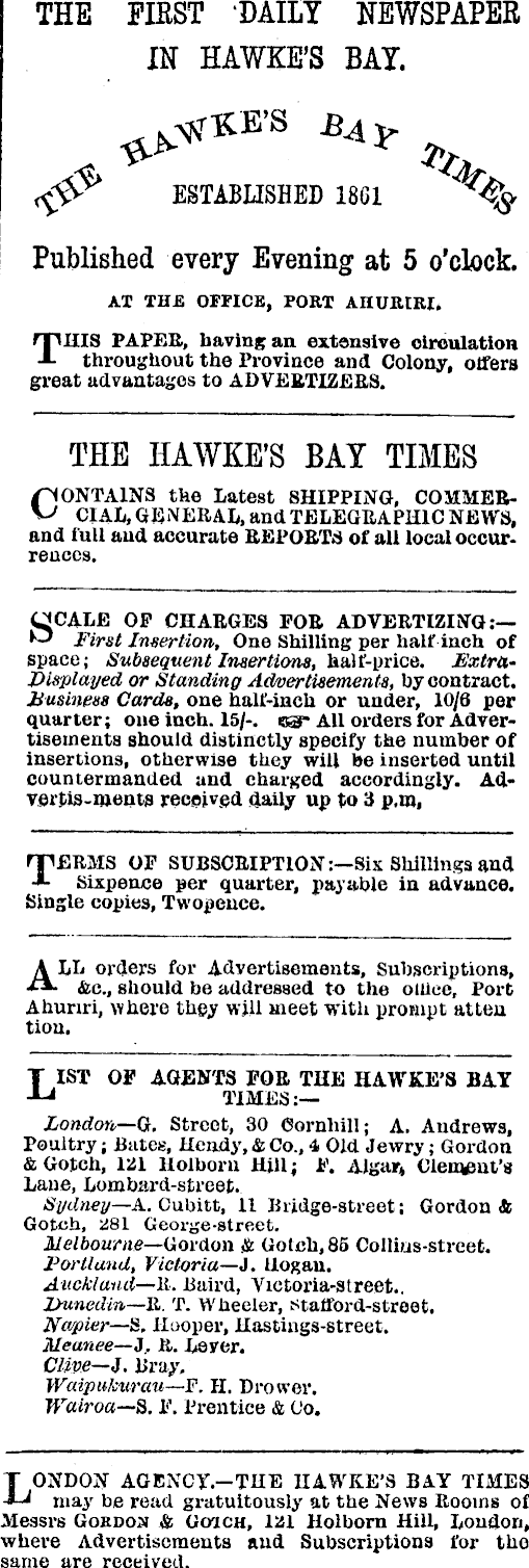 THE FIRST DAILY NEWSPAPER IN HAWKE'S BAY. *** t&r ESTABLISHED 1861 Published every Evening at 5 o'clock. AT TH£ OFFICE, PORT AHURIRI. THIS PAPER, having an extensive circulation throughout the Px-ovince and Colony, offers great advantages to ADVERTIZERB. THE HAWKE'S BAY TIMES CONTAINS the Latest BHIPPING, COMMERCIAL, GENERAL, and TELEGRAPHIC NEWS, and lull and accurate REPORTS of all local occurJCALE OP CHARGES FOR ADVERTIZING:— yj First Insertion, One Shilling per half inch of space; Subsequent Insertions, half-price. ExtraDisplayed or Standing Advertisements, by contract. Business Cards, one half-inch or under, 10/6 per quarter; one inch. 15/-. es» All orders for Advertisements should distinctly specify the number of insertions, otherwise they will be inserted until countermanded and charged accordingly. Ad-yertis-nients received daily up to 3 p,m, HPERMS OP SUBSCRIPTION:—Six Shillings and Sixpence per quarter, payable in advance. Single copies, Twopence. A LL orders for Advertisements, Subscriptions, &c, should be addressed to the oiilee, Port Ahuriri, where they will meet with prompt atten tion. LIST OF AGENTS FOR THE HAWKE'S BAT TIMES:— Londm—Gs. Street, 30 Oornhill; A. Andrews, Poultry; Bates, Hendy, & Co., 4 Old Jewry; Gordon &Gotch, ISJI Holborn Hill; F. Algar* Clemjent's Lane, Lombard-street. Sydney —A. Cubitt, 11 Bridge-street; Gordon & Gotch, aBl George-street. Melbourne— Gordon & Gotch, 85 Collius-street. Portland, Victoria —J. Uogau. Auckland —R. Baird, Victoria-street.. Dunedin —R. T. Wheeler, Stafford-street. Napier —S. Hooper, Hastings-street. Meanee—i. It. L9yer. Clive—i. Bray, Waipukurau—F. H. Drower. Wairoa— S. F. Prentice & Co. " ONDON AGENCY.-THE HAWKE'S BAY TIMES may be read gratuitously at the News Rooms of Messrs Goedojj & Gotch, 121 Holborn Hill, Loudon, where Advertisements and Subscriptions for the same are received.