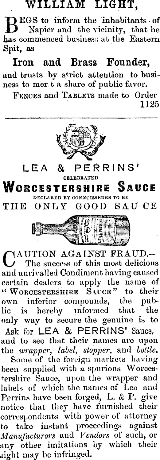 WILLIAM LIGHT, ~ EGS to inform the inhabitants of Napier and the vicinity, that he has commenced business at the Eastern Spit, as Iron and Brass Founder, and trusts by strict attention to business to mer t a share of public favor. Fences and Tablets made to Order 1125 LEA & PERRINS' CELEBRATED DKCLAKKD BY CONNOISSEURS TO BE THE ONLY GOOD SAUCE CAUTION AGAINST FRAUD.The success of this most delicious and unrivalled Condiment having caused certain dealers to apply the name of "Worcestershire Satce" to their own inferior compounds, the public is hereby informed that the only way to secure the genuine is to Ask for LEA & PERRINS' Sauce, and to see that their names are upon the wrapper, label, stopper, and bottle. Some of the foreign markets having been supplied with a spurious Worcestershire Sauce, upon the wrapper and labels of which the names of Lea and Perrins have been forged, L. & P. give notice that they have furnished their correspondents with power of attorney to take instant proceedings against Manufacturors and Vendors of such, or any other imitations by which their .light may be infringed.