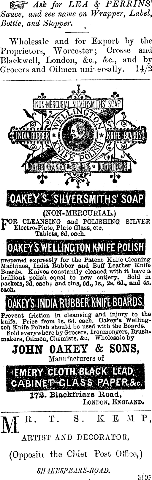 _ • Ask for LEA $ PERRINS' Sauce, and see name on Wrapper, Label, Bottle, and Stopper. Wholesale and for Export by the Proprietors, Worcester; Crosse and Blackwell, London, &c., &c, and by Grocers and Oilmen imr. ersally. 14/2 SMITHS'SOAP ill met* ■#~yK&BSa VMk RUBBER 1 !*iiipiiasiiipi OAKEY'S SILVERSMITHS' SOAP) (NON-MERCURIAL.) OR CLEANSING and POLISHING SILVER Electro-Plate, Plate Glass, etc. Tablets, 6d, each. OAKEYS WELLINGTON KNIFE POLISH prepared expressly for the Patent Knife Cleaning Machines, India Rubber and Buff Leather Knife Boardß. Knives constantly cleaned with it have a brilliant polish equal to new cutlery. Sold in packets, 3d. each; and tins, 6d., Is., 2s. 6d., and 4s. each. OAKEYS INDIA RUBBER KNIFE BOARDS.] Prevent friction in cleansing and injury to the knife. Price from Is. 6d. each. Oakey's Wellington Knife Polish should be used with the Boards. Sold everywhere by Grocers, Ironmongers, Brush, makers, Oilmen, Chemists. See. Wholesale by JOHN OAKEY & SONS, Manufacturers of EMERY CLOTH,BLACK LEAD, PAPER,&c. 173. Blacki'riars Road, London, England. R. T. S. KEMP, AETIIJT AND DECORATOR, (Opposite the CMet Post Office.) SUiKVSPEAIW'ROdD.