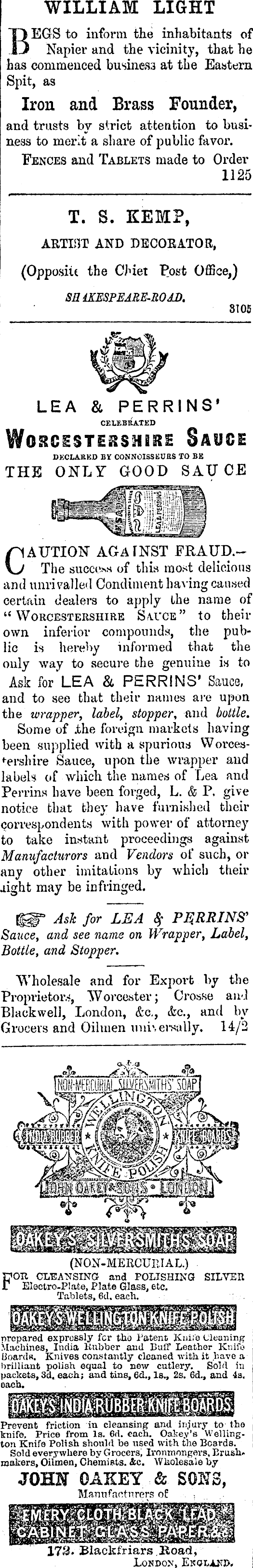 WILLIAM LIGHT EGS to inform the inhabitants of Napier and the vicinity, that he has commenced business at the Eastern Spit, as Iron and Brass Founder, and trusts by strict attention to business to merit a share of public favor. Fences and Tablets made to Order 1125 T. S. KEMP, ARTIttT AND DECORATOR, (Opposiu the CMet Post Office,) SR IKESPEARE-RO&D. LEA & PERRINS' CELEBRATED 1M4441 *>** If[*»\Lt<L!l DECLARED BIT CONNOISSEUES TO BE THE ONLY GOOD SAUCE CAUTION AGATNST FRAUD.U The success of this most delicious and unrivalled Condiment having caused certain dealers to apply the name of "Worcestershire Swce" to thenown inferior compounds, the public is hereby informed that the only way to secure the genuine is to Ask for LEA & PERRINS' Sauce, and to see that their names are upon the wrapper, label, stopper, and bottle. Some of .the foreign markets having been supplied with a spurious Worcestershire Sauce, upon the wrapper and labels of which the names of Lea and Perrins have been forged, L. & P. give notice that they have furnished their correspondents with power of attorney to take instant proceedings against Manufaeturors and Vendors of such, or any other imitations by which their light may be infringed. fH° Ask for LEA $ PE.RRIN& Sauce, and see name on Wrapper, Label, Bottle, and Stopper. Wholesale and for Export by the Proprietors, Worcester; Crosse and Blackwell, London, &c, &c, and by Grocers and Oilmen universally, 14/2 H£i (NON-MERCURIAL.) iOH CLEANSING and POLISHING SILVER Electro-Plate, Plate Glass, etc. Tablets, 6d, each. i^^glliiiiiii^ prepared expressly for tha Patent Knife Cleaning Slachines, India Rubber and Buff Leather Knife Boards. Knives constantly cleaned with it .have a brilliant polish equal to new cutlery. Sold in packets, 3d. each; and tins, 6d., Is., 2s. 6d., and 4s. each. l^fljJßlSfißg^^^P^ Prevent friction in cleansing and injury to the knife, Price from Is. 6d. each. Oalcey's Wellington Knife Polish should be used with the Boards. Sold everywhere by Grocers, Ironmongers, Brushmakers, Oilmen, Chemists. &c. Wholesale by JOHN OAKEY & SONS, Manufacturers of EM£RY,CLQffrBLACX LEfflfiß CABINET CLASS'P; 173. Blackfriars Eoad, London, Ekgujiix.
