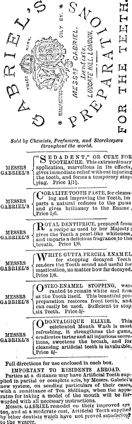 Sold by Chemists, Perfmners, and Storekeepers throughout the world. f'QEDADENT," OR CUBE FOE, £5 TOOTHACHE. This extraordinary MESSRS J application, marvellous in its effects, GABRIEL'S ] gives immediate relief without injuring | the tooth, and forms a temporary stop-: Lpiag. Price 1/1-J-. TOOTH PASTE, for cleausing and improving the Teeth, im parts a natural redness to the gums and gives brilliancy to the Ename, Price 1/6. > OY AL DENTIFRICE, prepared from * a recipe as used by her Majesty; _ :.,-„,.,„ < gives the Teeth a pearl-like whiteness, u A.bttU!iU » j an(i i m p ar ts a delicious fragrance to the Price 1/6. rTTKTHITE GUTTA I'ERCHA ENAMEL I* * for stopping decayed Teeth MESSRS J ren( j ers the Tooth sound and useful for GABRIEL'S | mas tication, no matter how far decayed. LPrice 1/6. ff\STEO-ENAMEL STOPPING, warv ranted to remain white and iirm MESSRS jas the Tooth itself. This beautiful preGABRIEL'S 1 preparation restores front teeth, and can easily be used. Sufficient to &top Teeth. Price 5/ELIXIR, This. j v/ celebrated Mouth Wash is most nrr.oet>« I refreshing, it strengthens th 3 gums, r, rSEv-S?** -> eradicates tartar and all injurious secre- | tions, sweetens the breath, and lor I cleansing artificial teeth is invaluable. LPrice 6/Full directions for use enclosed in each box. IMPORTANT TO RESIDENTS ABROAD. Parties at a distance may have Artificial Teeth supplied in partial or complete sots, by Messrs. Gabriel's, new system, on sending particulars of their cases, with a remittance of Ten Shillings, when the apparatus for taking a model of the mouth will be forwarded with all necessary instructions. Mossrs. GABRIEL remodel on their improved sy? ten. and at a moderate cost, Artificial Teeth supplied byothor dentists wnich have not proved satisiaeto££ to the wearer,