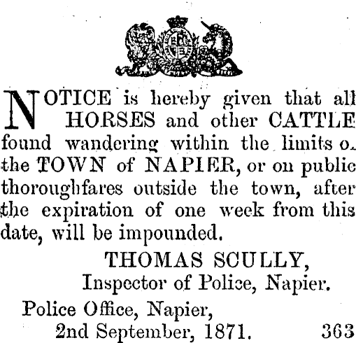 OTICE is hereby given that all HORSES and other CATTLE found wandering within the limits o. the TOWN of NAPIRR, or on public thoroughfares outside the town, after the expiration of one week from this date, will be impounded. THOMAS SCULLY, Inspector of Police, .Napier. Police Office, Napier, 2nd September, 1871. 363