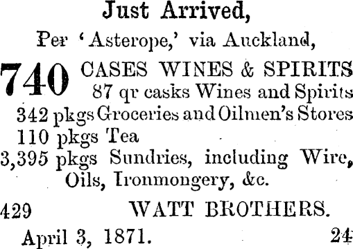 Just Arrived, Per * Asterope,' via Auckland, I CASES WINES & SPIRITS - 87 qr casks Wines and Spirits 342 pkgs Groceries and Oilmen's Stores llOpkgsTea 3,395 pkgs Sundries, including Wire, Oils, Ironmongery, &c. 429 WATT BROTHERS. April 3, 1871. 24