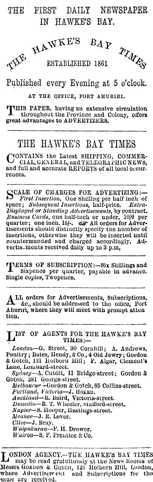 THE FIRST DAILY NEWSPAPER IN HAWKE'S BAT. ESTABLISHED 1861 Published every Evening at 5 o'clock. AT TUB OFFICE, PORT AHURIRI. THIS PAPER, having an extensive circulation throughout the Province and Colony, offers great advantages to AD VERTTZERS. THE HAWKE'S BAY TIMES CONTAINS the Latest SHIPPING, COMMERCIAL, GEN ERAL, and TELEGRAPHIC N EWS, and full and accurate REPORTS of all local occur. >CALE OF CHARGES FOR ADVERTIZING:— ' First Insertion, One Shilling per half inch of space; Subsequent Insertions, half-price. Extra,' Displayed or Standing Advertisements, hy contract. Business Cards, one half-inch or under, 10/6 per quarter; one iuch. 15/-. a®- All orders for Advertisements should distinctly specify the number of insertions, otherwise they will be inserted until countermanded and charged accordingly. Ad-vertis-nients received daily up to 3 p.m, TERMS OF SUBSCRIPTION:—Six Shillings and Sixpence per quarter, payable in advance. Single copies, Twopence. ' LL orders for Advertisements, Subscriptions, &c, should be addreissed to tho oilice, Port Ahunri, where they will meet with prompt atten tion. T IST OF AGENTS FOR THE HAWKE'S BAY TIMES;— London— G. Street, 30 Cornhill; A. Andrews, Poultry; Bates, Hendy, & Co., 4 Old Jewry; Gordou & Gotch, lal Holborn Hill; F. Algar, Clement's Lane, Lombard-street. Sydney— A. Cubitt, 11 Bridge-street; Gordon & Gotch, 281 George-street. Melbourn" -Gordon &;Gotch,Bs Collins-street, tortland, Victoria— J, UOMan. Auckland —R. Laird, Vjctoria-streot. Dunedin —R, T. Wheqler, stall'ord-strcet. Napier— S. Hooper, Hastings-street/ Mcanee—3 . R. Lever. Clive— J. Bray. Waipukurau —F. H. Drower. Wairoa— S. F. Prentice & Co. " ONDON AGEKCY.-TU'E HAWKE'S BAY TIMES I may be read gratuitously at the News Rooms of Messrs Goaijon & Goicii, 131 Holborn Hill, London, where Advertlscrrent and Subserij,>tious for tho ssiuic are received,
