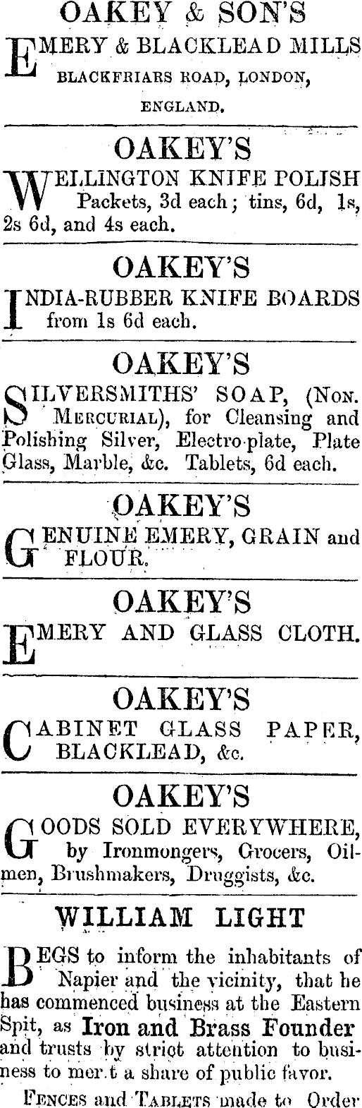 OAKEY & SON'S 7MERY & BLACKLEAD MILLS ' BLACKFRIAJRS ROAD, LONDON, ENGLAND. OAKEY'S ELLINGTON KNIFE POLISH „ / Packets, 3d each; tins, 6cl, Is, 2s 6d, and 4s each. OAKEY'S NDIA-RUBBER KNIFE BOARDS . from Is 6d each. OAKEY'S SILVERS MITHS' SOAP, (Non. Mercurial), for Cleansing and Polishing Silver, Electroplate, Plate Glass, Marble, &c. Tablets, 6d each. PAKEY'S ENUINE EMERY, GRAIN and " flour; OAKEYS IMERY AND GLASS CLOTH. OAKEYS CABINET GLASS PAPER, J BLACKLEAD, &c. OAKEYS OODS SOLD EVERYWHERE, T by Ironmongers, Grocers, Oilmen, Brush makers, Druggists, &c. WILLIAM LIGHT JIJ Napier and the vicinity, that he has commenced business at the Eastern Spit, as Iron and Brass Founder and trusts by strict attention to business to mer.t a share of public favor. Fences and Tablets made to Order