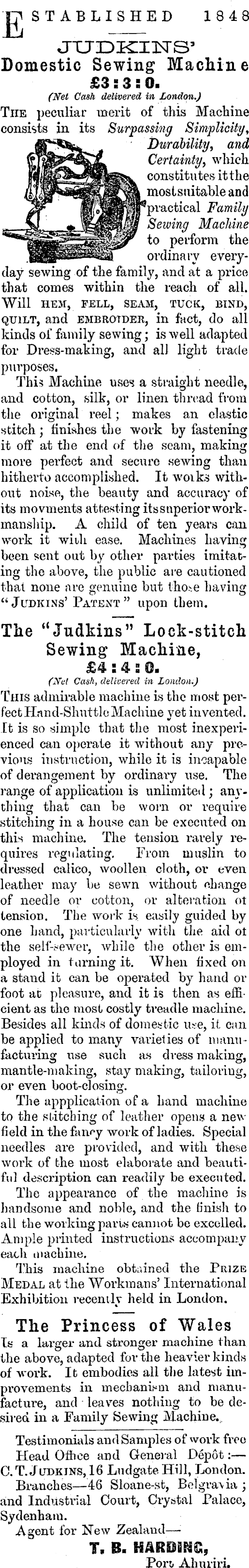 J"? ST ABLISHED 1848 JTJiDicrTsrs' Domestic Sewing Machin e £3:3 s 0. (Net Cash delivered in London.) The peculiar merit of this Machine consists in its Surpassing Simplicity, _ Durability, and Certainty, which constitutes it the mostsuitableand Family , Sewing Machine to perform the ordinary everyday sewing of the family, and at a price that comes within the reach of all. Will HEM, FELL, SEAM, TUCK, BIND, quilt, and embroider, in fact, do all kinds of family sewing; is well adapted for Dress-making, and all light trade purposes. This Machine uses a straight needle, and cotton, silk, or linen thread from the original reel; makes an elastic stitch ; finishes the work by fastening it off at the end of the seam, making more perfect and secure sewing than hitherto accomplished. It woiks without noise, the beauty and accuracy of its movments attesting its superior workman si lip. A child of ten years can work it with ease. Machines having been sent out by other parties imitating the above, the public are cautioned that none are genuine but tho>.e having " Judkins' Patent " upon them. The "Judkins" Lock-stitch Sewing Machine, (Net Cash, delivered in London.) This admirable machine is the most perfect Hand-Shuttle Machine yet invented. It is so simple that the most inexperienced can operate it without any previous instruction, while it is incapable of derangement by ordinary use. The range of application is unlimited ; anything that can be worn or require stitching in a house can be executed on this machine. The tension rarely requires regulating. From muslin to dressed calico, woollen cloth, or even leather may be sewn without change of needle or cotton, or alteration ot tension. The work is easily guided by one hand, particularly with the aid ot the self-sewer, while the other is employed in turning it. When fixed on a stand it can be operated by hand or foot at pleasure, and it is then as efficient as the most costly treadle machine. Besides all kinds of domestic use, it can be applied to many varieties of manufacturing use such as dress making, mantle-making, stay making, tailoring, or even boot-closing. The appplication of a hand machine to the stitching of leather opens a new field in the fanoy work of ladies. Special needles are provided, and with these work of the most elaborate and beautiful description can readily be executed. The appearance of the machine is handsome and noble, and the finish to all the working parts cannot be excelled. Ample printed instructions accompany each machine. This machine obtained the Prize Medal at the Workmans' International Exhibition recenilv held in London. The Princess of Wales Is a larger and stronger machine than the above, adapted for the heavier kinds of work. It embodies all the latest improvements in mechanism and manufacture, and leaves nothing to be desired in a Family Sewing Machine. Testimonials and Samples of work free Head Office and General Depot:— C. T. J udkins, 16 Ludgate Hill, London. Branches —46 Sloane-st, Belgravia ; and Industrial Court, Crystal Palace, Sydenham. Agent for New Zealand — Pon» Ahuriri.