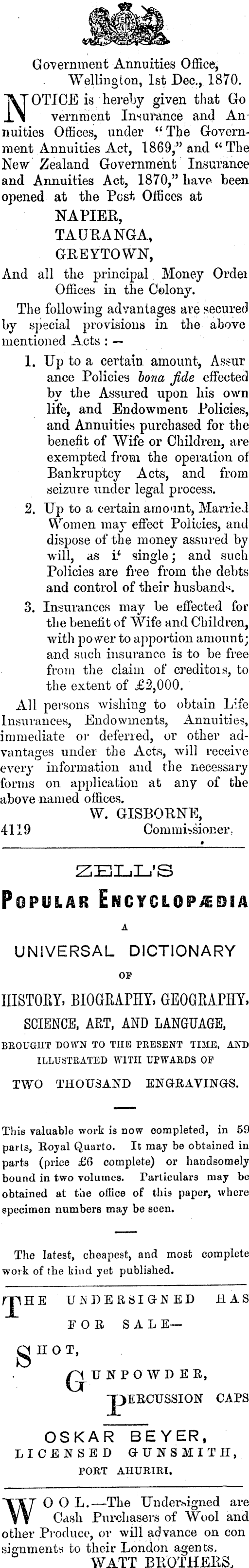 Government Annuities Office, Wellington, Ist Dec, 1870. NOTICE is hereby given that Go vernment Insurance ancj Annuities Offices, under "The Government Annuities Act, 1869," and " The New Zealand Government Insurance and Annuities Act, 1870," have been opened at the Pest Offices at NAPIER, TAUHANGA, GREYTOWN, And all the principal Money Ordei Offices in the Colony. The following advantages are secured by special provisions in the above mentioned Acts : 1. Up to a certain amount, Assur ance Policies bona fide effected by the Assured upon his own life, and Endowment Policies, and Annuities purchased for the benefit of "Wife or Children, are exempted from the operation of Bankruptcy Acts, and from seizure under legal process. 2. Up to a certain amount, Married Women may effect Policies, and dispose of the money assured by will, as i* single; and such Policies are free from the debts and control of their husband*. 3. Insurances may be effected for the benefit of Wife and Children, with power to apportion amount; and such insurance is to be free from the claim of creditois, to the extent of £2,000. All persons wishing to obtain Life Insurances, Endowments, Annuities, immediate or deferred, or other advantages under the Acts, will receive every information and the necessary forms on application at any of the above named offices. W. GISBORNE, 4119 Commissioner. Z3EHT iT i'ks UNIVERSAL DICTIONARY OF HISTORY, BIOGRAPHY, GEOGRAPHY, SCIENCE, ART, AND LANGUAGE, BROUGHT DOWN TO THE PRESENT TIME, AND ILLUSTRATED WITH UPWARDS OF TWO THOUSAND ENGRAVINGS. This valuable work is now completed, in 59 parts, Royal Quarto. It may be obtained in parts (price £0 complete) or handsomely bound in two volumes. Particulars may be obtained at the office of this paper, where specimen numbers may be seen. The latest, cheapest, and most complete work of the kind yet published. mHE UNDERSIGNED HAS FOR SALEHOT, U NPO WD ER, [>ERCUSSION CAPS OSKAR BEYER, LICENSED GUNSMITH, PORT AHURIRI. / O O L.—The Undersigned are Cash Purchasers of Wool and other Produce, or will advance on con signments to their London agents. WATT BROTHERS,