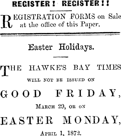 REGISTER I REGISTER ! I EGIST&ATION FORMS on Sale i at the office of tins Paper. Easter Holidays. THE HAWKE'S BAY TIMES WILL NOT BR ISSUED ON GOOD FRIDAY, March 29, or on EASTER MONDAY, Aran, 1, 1872.