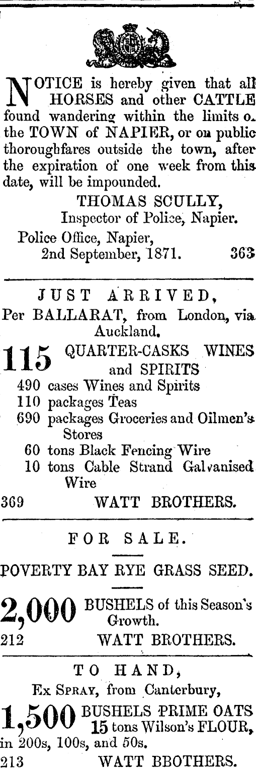 NOTICE is hereby given that all HORSES and other CATTLE found wandering within the limits o~ the TOWN of NAPIER, or on public thoroughfares outside the town, after the expiration of one week from thisdate, will be impounded. THOMAS SCULLY, Inspector of Police, Napier. Police Office, Napier, 2nd September, 1871. 363 JUST ARRIVED, Per BALL A RAT, from London, via. Auckland. K QUARTER-CASKS WINES ■** and SPIRITS 490 cases Wines and Spirits 110 packages Teas 690 packages Groceries and Oilmen's Stores 60 tons Black Fencing Wire 10 tons Cable Strand GaWanised Wire 369 WATT BROTHERS. FOR SALE. POVERTY BAY RYE GRASS SEED. - BUSHELS of this Seasons Growth. 212 WATT BROTHERS. TO HAND, Ex Spray, from Canterbury, I BUSHELS PRIME OATS - 7 - - 15 tons Wilson's FLOUR, in 200 s, 100 s, and 50s. 213 WATT BBOTHERS.