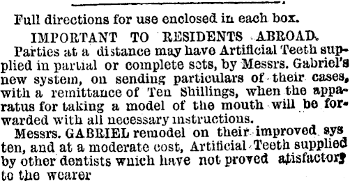 Full directions for use enclosed in each box. IMPORTANT TO RESIDENTS ABROAIX Parties at a distance may have Artificial Teeth supplied in partial or complete sots, toy Messrs. Gabriel's new system, on sending particulars of their cases, with a remittance of Ten Shillings, when the apparatus for taking a model of the mouth will be for« warded with all necessary instructions. Messrs. GABRIEL remodel on their improved sys ten, and at a moderate cost, Artificial Teeth supplied by other dentists wnich have not proved atisfactorf to the wearer