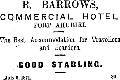 R. BARROWS, COMMERCIAL HOTEL POET AHURIRI. The Best Accommodation for Travellers and Boarders. GOOD STABLING. .July 6,1871.