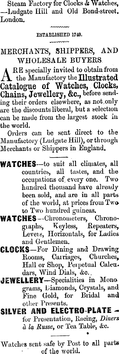 Steam Factory for Clocks & Watches, —Ludgate Hill and Old Bond-street. London. ESTABLISHED 1749. MERCHANTS, SHIPPERS, AISD WHOLESALE BUYERS RE specially invited to obtain from i. the Manufactory the Illustrated Catalogue of Watches, Clocks, Chains, Jewellery, &c, before sending their orders elsewhere, as not.only are the discounts liberal, but a selection can be made from the largest stock in the world. Orders can be sent direct to the Manufactory (Ludgate Hill), or through Merchants or Shippers in England. WATCHES— to suit all climates, all countries., all tastes, and. the occupations of, every one. Two hundred thousand have already been sold, and are in all parts of the world, at prices from Two--10 Two hundred guineas. WATCHES —Chronometers, Chrono* giaphs, Keyless, Repeaters, Levels, Horizontals, for Ladies, and Gentlemen. CLOCKS —For Dining and Drawing Rooms, Carriages, Churches,. Hall or Shop, Perpetual dars, Wind Dials, &e.. LERY —Specialities in Mono, grams, Liamonds, Crystals, and Fine Gold, for Bridal and other Presents. for Presentation, Racing, Diners a la Russe, or Tea Table, &c. Watches sent safe by Post to all parts of the world.