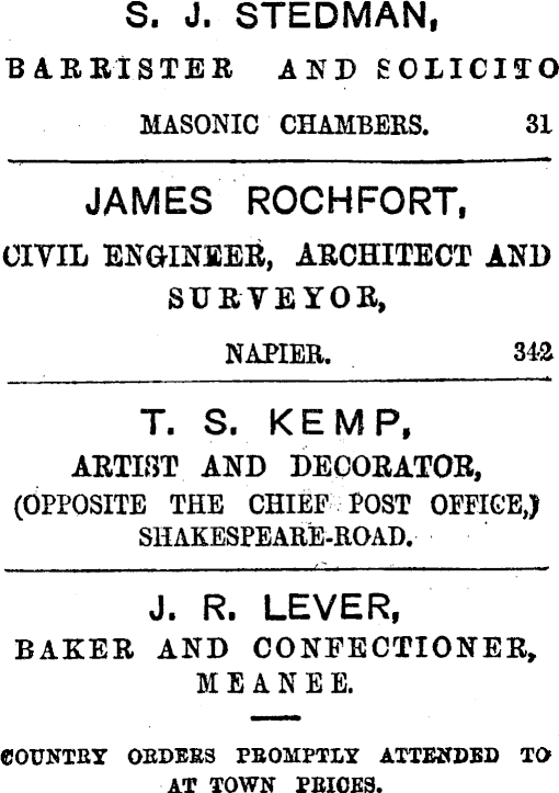 S. J. STEDMAN, BARRISTER AND EOLICIIO MASONIC CHAMBERS. 3? JAMES ROCHFORT. CIVIL ENGINEER, ARCHITECT AND SURVEYOR, NAPIER. 34& T. S. KEMP, ARTIST AND DECORATOR, (OPPOSITE THE CHIEF POST OFEIGE,) SHAKESPEARE-ROAD. J. R. LEVER, BAKER AND CONFECTIONER, M E A N E E. COUNTRY OBDEES PBQMPTLY ATTENDED TO AT TOWN PBIOES.