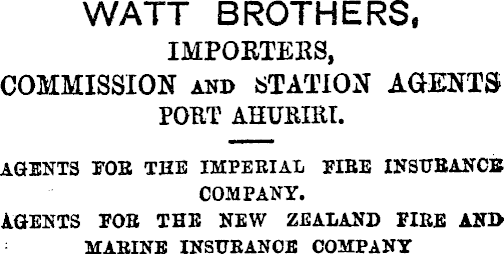 WATT BROTHERS, IMPORTERS, COMMISSION and STATION AGENTS POET AHUHIKI. AGENTS FOB THE IMPERIAL FIRE INSURANCE COMPANY. AGENTS FOB THE NEW ZEALAND FIRE AND MARINE INSURANCE COMPANY
