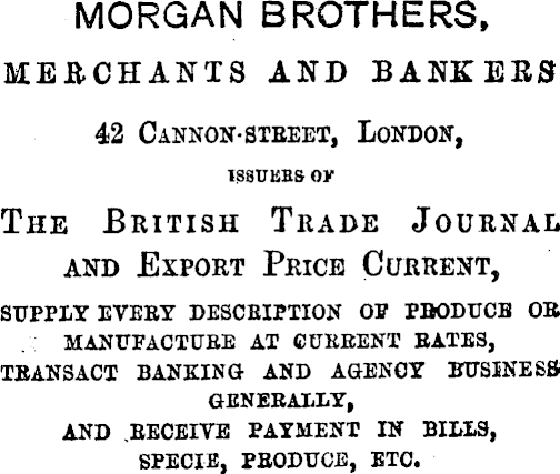 MORGAN BROTHERS, MERCHANTS AND BANKERS 42 Cannon- steeet, London, The British Trade Journal and Export Price Current, SUPPLY EVEET DESCRIPTION OB PBODUCB OE MANUFACTUBE AT CURBENT BATES, TBANSACT BANKING AND AGENCY BUSINESS GENERALLY, AND BECEIVE PAYMENT IN BILLS, SPECIE, PBODTJCE, ETC.