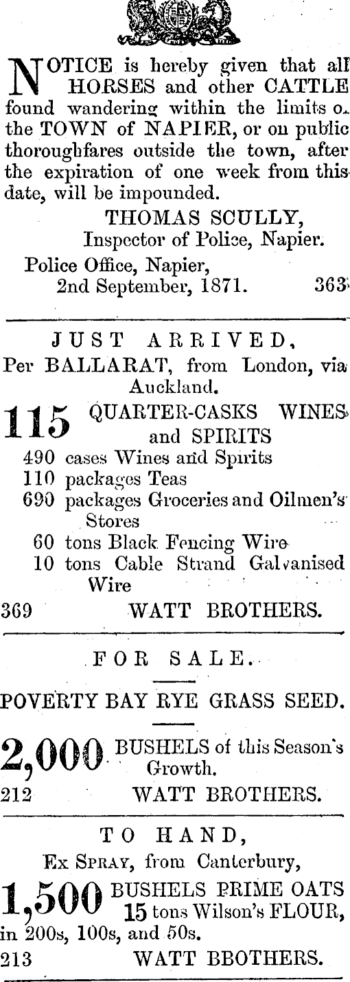 OTICE is hereby given that all HORSES and other CATTLE found wandering within the limits o. the TOWN of NAPIKR, or on public thoroughfares outside the town, after the expiration of one week from this date, will be impounded. THOMAS SCULLY, Inspector of Police, Napier. Police Office, Napier, 2nd September, 1871. 363> JUST ARRIVED, Per BALL A RAT, from London, via Auckland. 5 QUARTER-CASKS WINES* and SPIRITS 490 cases Wines and Spirits 110 packages Teas 690 packages Groceries and Oilmen's Stores 60 tons Black Fencing Wire 10 tons Cable Strand Galvanised Wire 369 WATT BROTHERS. FOR SALE. POVERTY BAY RYE GRASS SEED. BUSHELS of this Season s Growth. 212 WATT BROTHERS. TO HAND, Ex Spray, from Canterbury, ( BUSHELS PRIME OATS ; 15 tons Wilson's FLOUR, in 200 s, 100 s, and 50s. 213 WATT BBOTHERS.