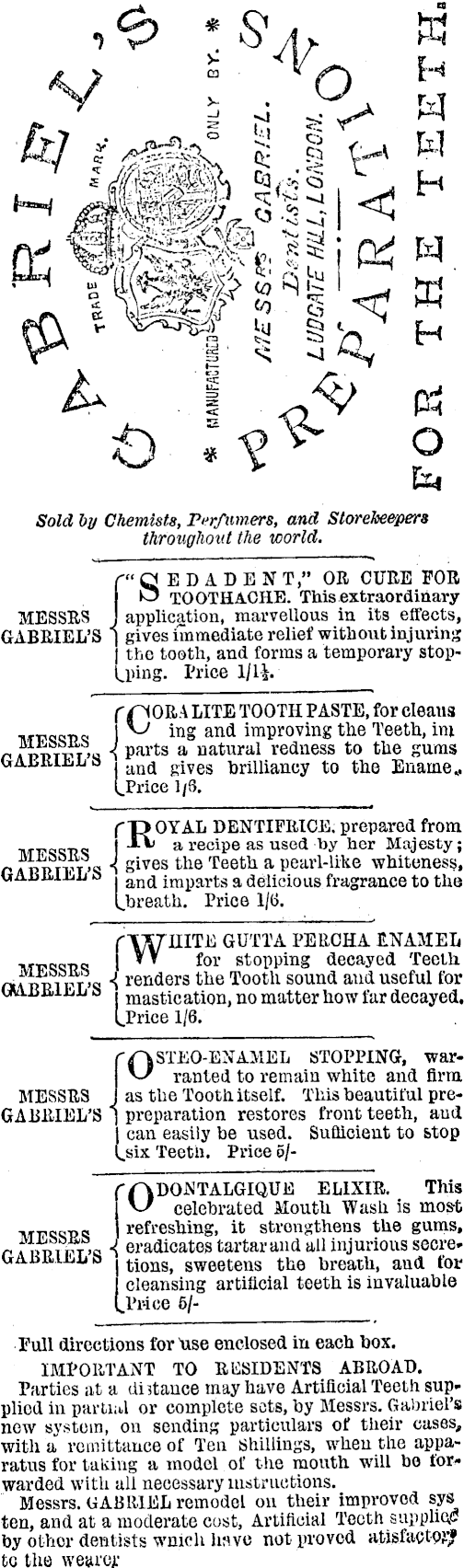 ■l' 3A, Sold by Chemists, Perfumers, and Storekeepers throughout the world. E D A D E N T," OR CURE FOR ' TOOTHACHE. This extraordinary MESSRS J application, marvellous in its effects, GABRIEL'S | gives immediate relief without injuring | the tooth, and forms a temporary stopping. Price 1/1-i. f <HORA LITE TOOTH PASTE, for cleans I V-' ing and improving the Teeth, ini I parts a natural redness to the gums ) and gives brilliancy to the Enarne„ [.Price 1/6. C T>OYAL DENTIFRICE, prepared from MT ,„,.„ I -t*< a recipe as used by her Majesty; f r^tvt% \ Sives the Teeth a pearl-like whiteness, GABRIEL o . an(J i m p ar tss a delicious fragrance to the Lbreath. Price 1/6. [7HITE GUTTA PEHCHA ENAMEL "5 renders the Tooth sound and useful for w&ii jujiiii & - mas ti ea tion, no matter how far decayed. IjPrice 1/6. STOPPING, warv ranted to remain white and firm MESSRS jas the Tooth itself. This beautiful preGABRIEL'S ] preparation restores front teeth, and | can easily be used. Sufficient to stop Teeth. Price 5/- , 8 „„XIR. This v/ celebrated Mouth Wash is most ATr««jpss I refreshing, it strengthens the gums, PAooTPT'a <! eradicates tartar and all injurious secreUAUiiiijij & . tions> swee tens the breath, and for cleansing artificial teeth is invaluable (.Price 6/Pull directions for "use enclosed in each box. IMPORTANT TO RESIDENTS ABROAD. Parties at a distance may have Artificial Teeth supplied in partial or complete sots, by Messrs. Gabriel's new system, on sending particulars of their cases, with a remittance of Ten Shillings, when the apparatus for taking a model of the mouth will be forwarded with all necessary instructions. Messrs. GABRIEL remodel on their improved sys ten, and at a moderate cost, Artificial Teeth supplied by other dentists wnich have not proved atisfactor» to the wearer