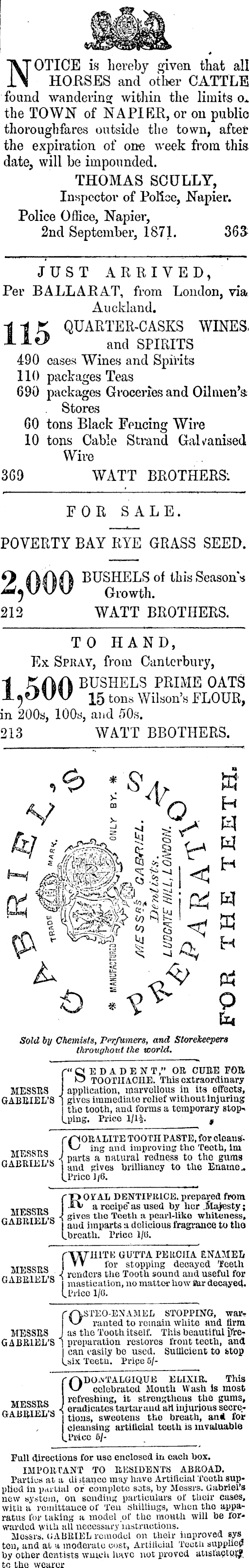 OTICE is hereby given that all ! HORSES and other CATTLE found wandering within the limits o* the TOWN of NAPIER, or on public thoroughfares outside the town, after the expiration of one week from this date, will be impounded. THOMAS SCULLY, Inspector of Police, Napier. Police Office, Napier, 2nd September, 1871. 363 JUST ARRIVED, Per BALL A RAT, from London, via Auckland. ' K QUARTER-CASKS WINES, ■** and SPIRITS 490 cases Wines and Spirits 110 packages Teas 690 packages Groceries and Oilmen's; Stores 60 tons Black Fencing Wire 10 tons Cable Strand Galvanised Wire 369 WATT BROTHERS: FOR SALE. POVERTY BAY RYE GRASS SEED. A BUSHELS of this Season s " Growth. 212 WATT BROTHERS. TO HAND, Ex Spray, from Canterbury, I BUSHELS PRIME OATS 7 15 tons Wilson's FLOUR, in 200 s, 100 s, and 50s. 213 WATT BBOTHERS. 7l *° J Sold by Chemists, Perfumers, and Storekeepers throughout the world. f'QEDADEN T," OR CUBE FOR i k 5 TOOTHACHE. This extraordinary MESSRS J application, marvellous in its effects, GABRIEL'S | gives immediate relief without injuring | the tooth, and forms a temporary stopLping. Price 1/1%. t A.LITE TOOTH PASTE, for cleans'ST> „ v-/ ing and improving the Teeth, ini MiwMis j p, u , ts a natura i redness to the gums LSI land gives brilliancy to the Ename.. (.Price 1/6. r"0 05TAL DENTIFRICE, prepared from wijiqe-nQ •"■*' a recipe"as used by her Majesty; itrtvt'S "i gives the Teeth a pearl-like whiteness, iiniuij & j aU(i } m p ar t s a delicious fragrance to tho Lbreath. Price 1/13. fYjn-RITK GUTTA PERCIIA ENAMEL ~.„_„ |VV for stopping decayed Teeth i \vfxtk *> renders the Tooth sound and useful for 11>1j!s . mas tication, no mattor how Jfar decayed. LlMce l/o. f/\STEO-ENAMEL STOPPING, war* v/ ranted to remain white and Arm MESSRS Jas the Tooth itself. This beautiful jfreGABRIEL'S | preparation restores front teeth, and | can easily be used. Sufficient to &top Ijsix Teetn. Pripe 5/ELIXIR. This V-J celebrated Mouth Wash is most refreshing, it strengthens the gums, r fmjTPT'si <, eradicates tartar and art injurious secrea tions, sweetens the breath, an* for j cleansing artificial teeth is invaluable L Price 5/Full directions for use enclosed in each box. IMPORTANT TO RESIDENTS ABROAD. Parties at a di stance may have Artificial Teeth supplied in partial or complete sots, by Messrs. Gabriel's new system, on sending particulars of their cases, with a remittance of Ten shillings, when tho apparatus for taking a model or the mouth will be forwarded with all necessary instructions. Messrs. (JABRIEL remodel on their improved sys ten, and at a moderate cost, Artificial Teeth supplied by other dentists wuteh have not proved atisfactpr£ tc the wearer