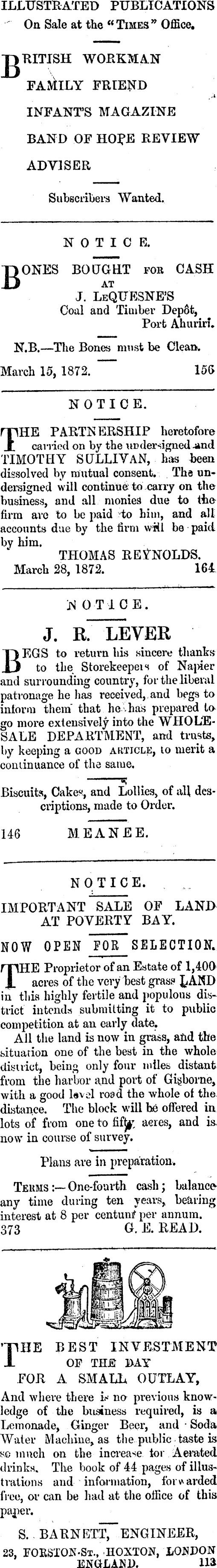 ILLUSTRATED PUBLICATIONS On Sale at the « Times » Office. RITISH WORKMAN FAMILY FRIEND INFANT'S MAGAZINE BAND OF HO?E REVIEW ADVISER Subscribers Wanted. NOTICE. ONES BOUGHT for CASH AT J. LeQUESNE'S Coal and Timber Dep6t, Port Ahurirf. N.B. —The Bones must be Clean. March 15, 1872. 15G NOTICE. THE PARTNERSHIP heretofore earned on by the undersigned -and TIMOTHY SULLIVAN, has heen dissolved by mutual consent. The undersigned will continue; to carry on the business, and all monies due to the firm arc to be paid to him, and all accounts due by the firm wiil be paid by him. THOMAS REYNOLDS. March 28, 1872. 164 W OTICE. J. R. LEVER BEGS to return Ids sincere thanks to tie Storekeeper of Napier and surrounding country, for the liberal patronage he has received,,and begs to inform them' that he has prepared La go more extensively into the WHOLESALE DEPARTMENT, and trusts, by keeping a good article, to merit a continuance of the same. Biscuits, Cakes:, and Lollies, of a-H descriptions, made to Order. 146 MEANEE. NOTICE. IMPORTANT SALE OF LAND AT POVERTY BAY. NOW OPEN FOR SELECTION. THE Proprietor of an Estate of 1,400 acres of the very best grass? in this highly fertile and populous district intends submitting it to public competition at an early date. All the land is now in grass, and the situation one of the best in the whole district, being only four mtles distant from the harbor and port of Gisborne, with a good level road the whole of the distance. The block will be offered in lots of from one to fiftpr acres, and is. now in course of survey. Plans are in preparation. Terms:~One-fourth cash; balance any time during ten years, bearing interest at 8 per centum? per annum. 373 O. E. READ. IHE BEST INVESTMENT OF THE I>AY FOR A SMALL OUTLAY, And where there i.-' no previous knowledge of the business required, is a Lemonade, Ginger Beer, and • Soda Water Machine, as the public taste is so much on the increase tor Aerated drinks. The book of 44 pages of illustrations and information, forwarded free, or can be had at the office of this paper. S. BARNETtTENGINEER, 23, FORSION-St., HOXTON, LONDON ENGLAND. US