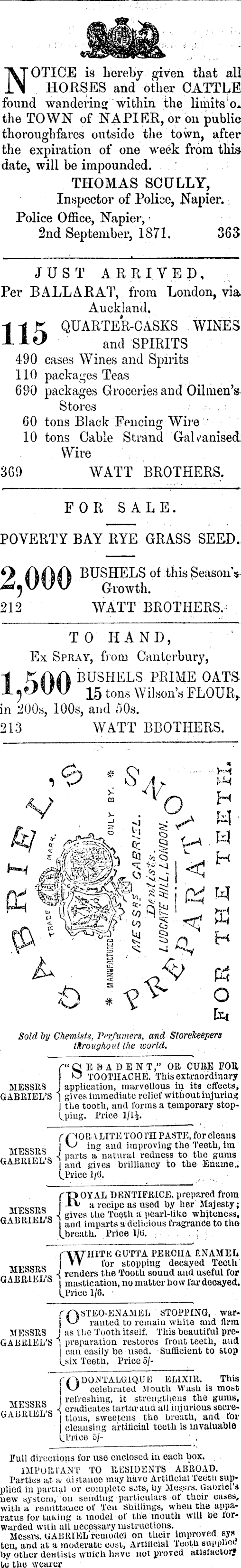 NOTICE is hereby given that all HORSES and other CATTLE found wandering within the limits'o* the TOWN of NAPIER, or on public thoroughfares outside the town, after the expiration of one week from this date 5 will be impounded. THOMAS SCULLY, Inspector of Police, Napier. Police Office, Napier, • 2nd September, 1871. 363 JUST ARRIVED, Per BALL A RAT, from London, via Auckland. -j k QUARTER-CASKS WINES ■** and SPIRITS 490 cases Wines and Spirits 110 packages Teas 690 packages Groceries and Oilmen's Stores 60 tons Black Fencing Wire 10 tons Cable Strand Galvanised Wire 369 WATT BROTHERS. FOR SALE. POVERTY BAY RYE GRASS SEED. Ck s\/\/} BUSHELS of .this Season* J Growth. 212 WATT BROTHERS, TO HAND, Ex Spray, from Canterbury, - /\/\ BUSHELS PRIME OATS * 15 tons Wilson's FLOUR, in 200 s, 100 s, and 00a. 213 WATT BBOTHERS. u* w Sold by Chemists, Perfumers, and Storekeepers throughout the world. JEBADEJT T," OR CUBE FOB I TOOTHACHE. This extraordinary MESSRS J application, marvellous in its effects, ftATjRiEL'S j gives immediate relief with out injuring | the tooth, and forms a temporary stopping. Price 1/I*. f TOOTH PASTE, for cleans th-pssps I in S and improving the Teeth, im n aljwtvt •« i P arts a natural redness to the gums GABiUi.ii& an(i gives t)niii anC y to the Ehame.. (.Price l/t>. fO OYAL DENTIFRICE, prepared from „. I I* a recipe as used by her Majesty; r a pi™»« ■{ S ives Llie Tc eth a pearl-like whiteness, (xAbltiJiiL ft anfl im p ftrts a delicious fragrance to the tbreath. Price l/o. [THITE GUTTA PERCH A ENAMEL I T ' for stopping decayed Teeth fr „ ■ ~T , , ■{ renders the Tooth sound and useful for GABRli.ii is j mastication, no matter how far decayed. L.Pricel/6. f/"\STEO-ENAMEL STOPPING, war- | " ranted to remain white and firm MESSRS Jas the Tooth itself. This beautiful preGABRIEL'S ] preparation restores front teeth, and | can easily be used. Sufficient to stop Teeth. Price 5/ELIXIR. This | v-f celebrated Mouth Wash is most ~_.,., | refreshing, it strengthens the gums, ~ fIM, T ,Tr,o \ eradicates tartarand all injurious secreGAbliii.ii & | tiolls> swe etens the breath, and for cleansing artificial teeth is invaluable [.Price 5/Eull directions for use enclosed in each box. IMPORTANT TO RESIDENTS ABROAD. Parties at a- distance may have Artificial Teetn supplied in partial or complete sots, by Messrs. Gabriel's new system, on sending particulars of their cases, with a remittance of Ten Shillings, when the apparatus for taking a model of the mouth will be forwarded with all necessary instructions. Messrs. GABRIEL remodel on their improved ten, and at a moderate cost, Artificial Teoth supplied by other dentists wnich have not proved atislactor* to the wearer