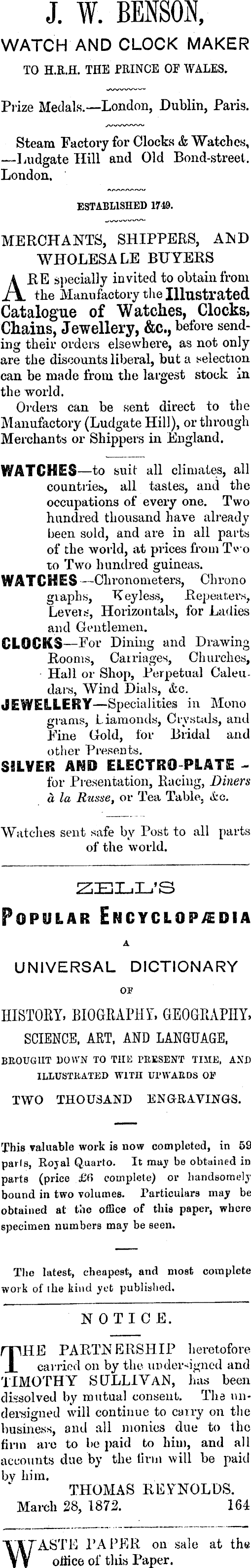 J. W. BENSON, WATCH AND CLOCK MAKER TO H.R.H. THE FRINGE OF WALES. Prize Medals.—London, Dublin, Paris. Steam Factory for Clocks & Watches, —Ludgate Hill and Old Bond-street. London. ESTABLISHED 1749. MERCHANTS, SHIPPERS, AND WHOLESALE BUYERS ARE specially invited to obtain from the Manufactory the Illustrated Catalogue of Watches, Clocks, Chains, Jewellery, &c, before sending their orders elsewhere, as not only are the discounts liberal, but a selection can be made from the largest stock in the world. Orders can be sent direct to the Manufactory (Ludgate Hill), or through Merchants or Shippers in England. WATCHES— to suit all climates, all countries all tastes, and the occupations of every one. Two hundred thousand have already been sold, and are in all parts of the world, at prices from Tvo to Two hundred guineas. WATCHES —Chronometers, Chrono graphs, TCeyless, Repeaters, Levels, Horizontals, for Ladies and Gentlemen. CLOCKS —For Dining and Drawing Rooms, Carriages, Churches, Hall or Shop, Perpetual Calendars, Wind Dials, &c. JEWELLERY— Specialities in Mono grams, Liamonds, Crystals, and Pine Gold, for Bridal and other Presents. SILVER AND ELECTRO-PLATE - for Presentation, Racing, Diners a la Russe, or Tea Table, tfce. Watches sent safe by Post to all parts of the world. 2j"FiT iT j k 3 UNIVERSAL DICTIONARY OF HISTORY, BIOGRAPHY, GEOGRAPHY, SCIENCE, ART, AND LANGUAGE, BROUGHT DOWN TO THE PRESENT TIME, AND ILLUSTRATED WITH UPWARDS OF TWO THOUSAND ENGRAVINGS. This valuable work is now completed, in 59 Paris, Eojal Quarto. It may be obtained in parts (price £P» complete) or handsomely bound in two volumes. Particulars may be obtained at the office of this paper, where specimen numbers may be seen. The latest, cheapest, and most complete work of the kind yet published. NOTICE. THE PARTNERSHIP heretofore carried on by the underpinned and TIMOTHY SULLIVAN, lias been dissolved by mutual consent. The undersigned will continue to carry on the business, and all monies due to the firm are to be paid to him, and all accounts due by the firm will be paid by him. THOMAS REYNOLDS. March 28, 1872. 164 ASTE PAPER on sale at the oiiice of this Paper.