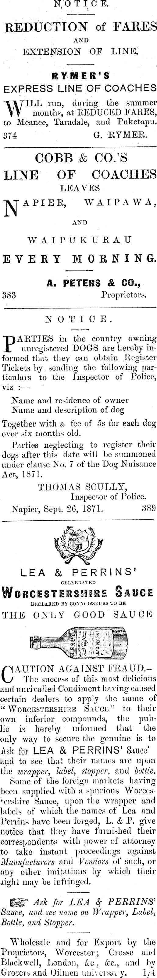 NOTICE. REDUCTION of FARES EXTENSION OP LINE. RYMER'S EXPRESS LINE OF COACHES WILL run, chiving the summer months, at REDUCED FARES, to Meanee, Taradale, and Puketapu. 374 G. RYMER. COBB & GO'S LINE OF COACHES LEAVES A PIER, WAIPA WA, WAIPUKURAU EVERY MORNING, 383 Proprietors. NOTICE. i ARTIES in the country owning unregistered DOGS are hereby informed that they can obtain Register Tickets by sending the following particulars to the Inspector of Police, viz : Name and residence of owner Name and description of dog Together with a fee of os for each dog over six months old. Parties neglecting to register their dogs after this date will be summoned under clause No. 7 of the Dog Nuisance Act, 1871. THOMAS SCULLY, Inspector of Police. Napier, Sept. 26, 1871. 389 t&fcr^Hfc LEA & PERRINS' CELEBRATED DKCLAKEI) BY CONNC ISSEUitS TO BE THE ONLY GOOD SAUCE f IAUTION AGAINST FRAUD.{J The success of this most delicious and unrivalled Condiment having caused certain dealers to apply the name of "Worcestershire S.vuce" to their own inferior compounds, the public is hereby informed that the only way to secure the genuine is to Ask for LEA & PERRINS' Saucs' and to see that their names are upon the wrapper, label, stopper, and buttle. Some of the foreign markets having been supplied with a spurious Worcestershire Sauce, upon the wrapper and labels of which the names of Lea and Perrins have been forged, L. & P. give notice that they have furnished their correspondents with power of attorney to take instant proceedings against Manufacturers and Vendors of such, or any other imitations by which their .right may be infringed. gr Ash for LEA $ PERRINS' Sauce, and see name on Wrapper, Label, Bottle, and Stopper. Wholesale and for Export by the Proprietors, Worcester; Crosse and Blac'kwell, London, & c, (fee., and by C/'roccvs and Oilmen universal y. 1/4