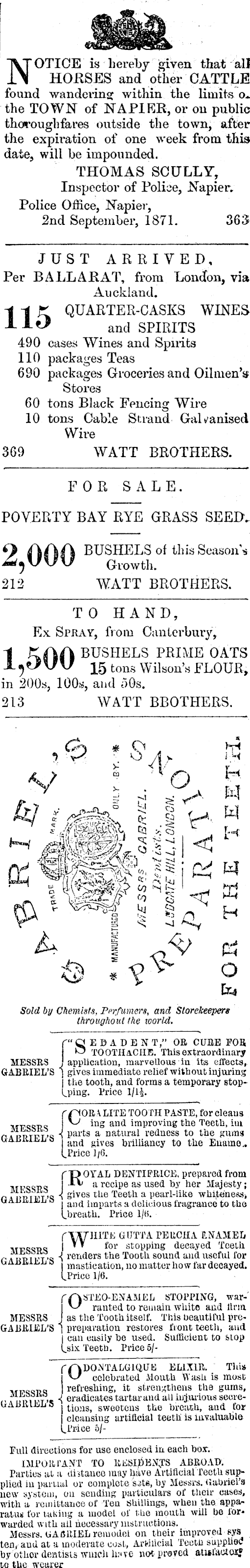 NOTICE is hereby given that all HORSES and other CATTLE found wandering within the limits o* the TOWN of NAPIER, or on public thoroughfares outside the town, after the expiration of one week from this date, will be impounded. THOMAS SCULLY, Inspector of Police, Napier, Police Office, Napier, 2nd September, 1871. 363 JUST ARRIVED, Per BALL A RAT, from London, via Auckland. K QUARTER-CASKS WINES and SPIRITS 490 cases Wines and Spirits 110 packages Teas 690 packages Groceries and Oilmen's* Stores 60 tons Black Fencing Wire 10 tons Cable Strand Galvanised Wire 369 WATT BROTHERS. FOR SALE. POVERTY BAY RYE GRASS SEED". BUSHELS of this Seasons Growth. 01 h WATT BROTHERS. TO HAND, Ex Spray, from Canterbury, I BUSHELS PRIME OATS , 15 tons Wilson's FLOUR, in 200 s, 100 s, and oos. 213 WATT BBOTHERS. C 3 •:* ? jar Ui g n Sold by Chemists, Perfumers, and Storekeepers throughout the world. (EDADEN T," OB CUBE FOB TOOTHACHE. This extraordinary MESSES .'application, marvellous in its effects,. fiATmrEiTj's "} gives immediate relief without injuring | the tooth, and forms a temporary stopLpiug. Price 1/I|. rpOE A LITE TOOTH PASTE, for cleans mvss'rs ing and ira P rovni B tae Teeth, iui M , s ■{ parts a natural redness to the gums I and gives brilliancy to the Euaine.. (JPricel/6. GABRIEL'S 3 O YAL DENTIFRICE, prepared from J a recipe as used by her Majesty; gives the Teeth a pearl-like whiteness* j and imparts a delicious fragrance to the (.breath. Price 1/8. f "WHITE GUTTA PEItCHA RNAMEIi | »V for stopping decayed Teeth -{ renders the Tooth sound and useful for I mastication, no matter how far decayed. LPrice 1/6. f ( JSTJSU-Jii-NAMEL STOPPING, war- " ranted to remain white and ilnn MESSRS Jas the Tooth itself. This beautiful preGABRIEL'S | preparation restores front teeth, aud can easily be used. Sufficient to stop (.six Teeth. Price 5/IXIR. Tlii* j vy celebrated Mouth Wash is most -.p.jopo j refreshing, it strengthens tlia gums, n f i!i)i pt'« *\ eradicates tartar and all injurious secreUAiiHiJijiiS j tions, sweetens the breath, aud for [ cleansing artificial teeth is invaluable (.i'riee 5/Full directions for use enclosed in each box. IMPORTANT TO RESIDENTS ABROAD. Parties at a di stance may have Artificial Teeth supplied in pariial or complete sate, by Messrs. Gabriel's new system, on sending particulars of their cases, with a remittance of Ten Shillings, when the apparatus for taking a model of the mouth will be forwarded with all necessary instructions. Messrs. GAGBIEL remodel on their improved sys ten, and at a moderate cost, Arfciticial Teeth supplier by other dentists wnieh huve not proved atisfaotosj to the wearer