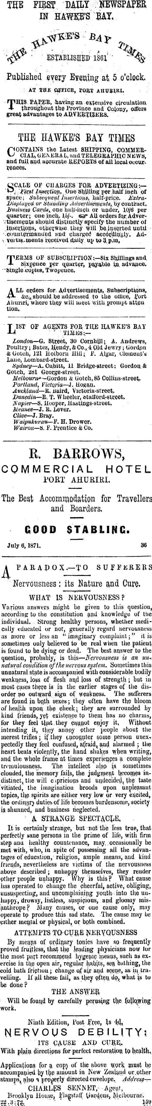 THE FHtST DAILY HEWSPAPER IN HAWK'S BAY. <sy ■ ESTABLISHED 186 X ' $& Published every Eyeing at 5 o'clock. AT TS£ WFICE, fOJtiiT AHUJURI. THIS. PAEEB, having an extensive circulation throughout the Province and Colony, offers great advantages to AGVEIi/TWiiRS. THE HAWJOT BAY THIS CONTAINS the Latest SHIPPING, COMMERCIAL, GENEItAL, and TELEGEAPIHC NEWS, and full and accurate JiEPORTS of all local occurrences. OF CHARGES fQR ADVERTIZING :- 5: 'i'mt One Shilling per.half inph of space; Subsequent Insertions,, half-prige. ExtraJUispluyed or St,wiiding Advertisements,, by contract. Husiness Cards,, one half-incu or under, 10/6 per quarter; one inch. Id/-, sa- All orders for Advertisements should distinctly specify the number of .insertions, otherwise they will be, inserted until .countprhianaed and charged accordingly. Yertis.-inents received daily up to 3. pan, TERMS OF SUBSCRIPTION:—Six Shillings and sixpence per quarter, payable in. advance. • Single Copies, Twopence. * LL orders for. Advertisements, Subscriptions, &u.j should be adfjressecl to the oniee, i'ort Almririj where they will meet with prompt atten tion. IST OF AGENTS FOR THE HAWKE'S BAY ' TIMES;— London,— G. Street, 30 CornhUl;. A. Andrews, Poultry; Bates, ijendy, & Co., 4 Old Jewry; Gordon & Uotoh, 121 Holborn Hill; F. Algar, Clement's Lane, Lombard-street. Sydney—A.. Cubitt, il Bridge-Street; Gordon. & Gotch, 281 George-street. Melbourne— Gordon & Gotch,Bs Collins-street. Portland, Victoria—i. Hogan. Auckland— R. Baird, Victoria-street. Dunedin— R. T. Wheeler, Stafford-street. Napier— S. Uooper, Hastings-street. Meanee—J. R. Lever. dive—J. Bray. Waipukurau —F. H. Drower. Wairoa— S. F. Prentice & Co. R. BARROWS, COMMERCIAL HOTEL PORT AHURIRI. The Best Accommodation f° r Travellers and Boarders. GOOD STABLIKC. July 6,1871. PARAPO^.—TO SUEEEKEftS Nervousness: its Nature and Cure. WHAT IS NERVOUSNESS? Various answers might be given to this question, according to the constitution and knowledge of the individual. Strong healthy persons, whether medically educated or not, generally regard nervousness as more or less an " imaginary complaint;" it is sometimes only believed to be real when the patieut is found to be dying or dead. The best answer to the question, probably, is this^ — Nervousness is an mir natural condition of the nervous system. Sometimes this unnatural state is accompanied with considerable bodily weakness, loss of flesh an,d loss of strength; but in most pases there is in the earlier stages of the disorder no outward sign of weakness. The sufferers are found in bgth sexes; they often have the bloom of health upoii the cheeky they are surrounded by kind friends, yet existence to them has no charms, for they feel that.they cannot enjoy it, Without intending it, th.ey annoy other people about the merest trifles; if-they encounter some person unexpectedly they feel confused, aud alarmed ; the heart beats violently, the hand shakes writing, and the whole frame at times experiences a complete tmnulousness. The intellect 'also \s sometimes clouded, the memory fails, the judgment becomes indistinct, tlie will c ipricious and (he taste vitiated, the imagination broods upon unpleasant topics, the spirits are either very low or very excited, the ordinary duties of life becomes burdensome, society 18 shunned, and business neglected. A STRANGE SPECTACLE, It is certainly strange, but not the less true, that perfectly sane persons in the prime of life, with firm step and healthy countenance, may, occasionally be met with, who, in spite of possessing ail the advantages of education, religion, ample means, and kind ihen,ds, nevertheless are victims of the nervousness aboye described; unhappy themselves, they render pthpr people unhappy. Why is this ? What cause lias operated to change the cheerful, active, obliging, unsuspecting, aud uncomplaining youth into the uuhappy, drowsy, listless, suspicious, and gloomy misanthrope f iVlany causes, or one cause only, may operate tp produce this sad state. The cause may be cither mental or physical, or both combined. ATTEMPTS TO CURE NERVOUSNESS By means of ordinary tonics have so frequently proved fruitless, that the leading physicians now tor the most part recommend hygeuic means, such as exercise in tl\e open air, regular habits, sea. bathing, the cold bath friction j change of a;r and sceue, as in, travelling. If {ill these fail, as they often do, what js to be done ? THE ANSWER Will be found by carefully perusing the following work. Ninth Edition, Tost Free, Is 4<J, NERVOUS DEBILITY? ITS CAUSE AND CUREi. With plain directions for perfect restoration, tp health. Applications for a copj of the above work must be accompanied by the amount iu New Zealand yr.other also n property directed envelope. Address—- ' CHARLES SENNET, Agent, Bropklyu House, Flagstaff fcranjeus, Melbourne. 22.3; 7s. ' 15*J