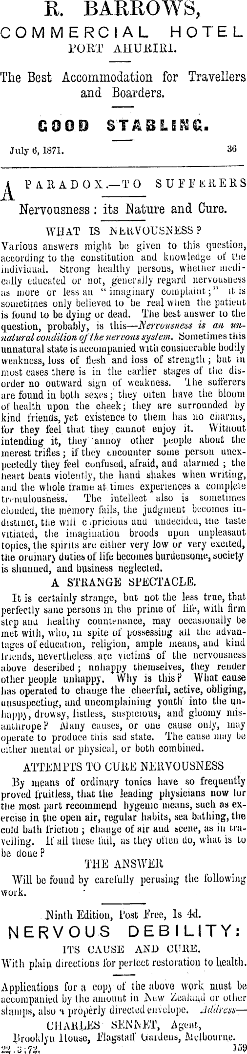 R. BARROWS, COMMERCIAL HOTEL PORT AHUIIIRI. The Best Accommodation for Travellers and Boarders. GOOD STABLING. July 6, 1871. 36 Nervousness : its Nature and Cure. WHAT IS NERVOUSNESS ? Various answers might be given to this question, according to the constitution and knowledge of the individual. Strong healthy persons, whether medically educated or not, generally regard nervousness as more or less an “ imaginary complaint; ” it is sometimes only believed to be real when the patient is found to be dying or dead. The best answer to the question, probably, is this —Nervousness is an 'unnatural condition of the nervous system. Sometimes this unnatural state is accompanied with considerable bodily weakness, loss of llesh and loss of strengtli; but in most cases there is in the earlier stages of the disorder no outward sign of weakness, 'ihe sufferers are found in both sexes 5 they oiten have the bloom of health upon the cheek; they are surrounded by kind friends, yet existence to them has no charms, for they feel that they cannot enjoy it. Without intending it, they annoy other people about the merest trifles; if they encounter some person unexpectedly they feel confused, afraid, and alarmed ; the heart beats violently, the hand shakes when writing, and the whole frame at times experiences a complete tivmulousness. The intellect also is sometimes clouded, the memory fails, the judgment becomes indistinct, the will c ipncious and uudecideu, me taste vitiated, the imagination broods upon unpleasant topics, the spirits are either very low or very excited, the ordinary duties of life becomes burdensome, society is slimmed, aud business neglected. A STRANGE SPECTACLE. It is certainly strange, but not the less true, that perfectly sane persons in the prime of life, with firm step and healthy countenance, may occasionally be met with, who, m spite of possessing all the advantages of education, religion, ample means, aud kind Ineiids, nevertheless are victims of the nervousness above described; unhappy themselves, they render other people unhappy, Why is this? What cause has operated to change the cheerful, active, obliging, unsuspecting, and uncomplaining youth into the unhappy, drowsy, listless, suspicious* and gloomy misanthrope? Alany causes, or one cause ouly, may operate to produce this sad state. The cause may be cither meulal or physical, or both combined. ATTEMPTS TO CURE NERVOUSNESS By means of ordinary tonics have so frequently proved fruitless, that the leading physicians now lor tiie most part recommend hygemc means, such as exercise in the open air, regular habits, sea bathing, the cold batli friction ; change of air and scene, as in travelling. if all these lull, as they often do, what is to be done ? THE ANSWER Will be found by carefully perusing the following work. Ninth Edition, Post Tree, Is 4d. NERVOUS DEBILITY: ITS CAUSE AND CUKE. With plain directions for pericct restoration to health. Applications for a cop} of the above work must be accompanied by the amount in New' Zealand or other slumps, also h properly directed envelope. Address — CHARLES SENNET, Agent, Brooklyn House, Plugs tall Cardens, Melbourne.