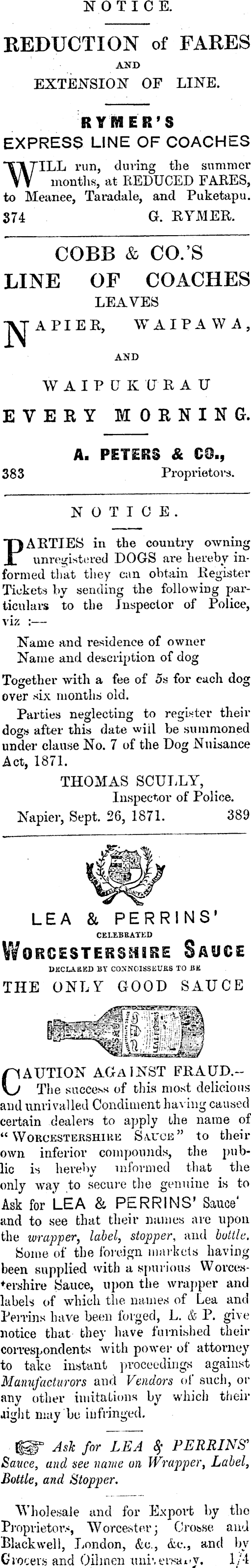 NOTICE. REDUCTION of FARES AND EXTENSION OF LINE. RY ME ITS EXPRESS LINE OF COACHES TILL run, during the summer ' months, at REDUCED FARES, to Meanee, Taradale, and Puketapu. 374 G. RYMER. COBB & CO.S LINE OF COACHES LEAVES A PIER, WAIPAW A, WAIPU K U R A U EVEEY MORNING. & CO., Proprietors. NOTICE. ARTIES in the country owning unregistered DOGS are hereby informed that they can obtain Register Tickets by sending the following particulars to the Inspector of Police, viz : Name and residence of owner Name and description of dog Together with a fee of 5s for each dog over six months old. Parties neglecting to register their dogs after this date will be summoned under clause No. 7 of the Dog Nuisance Act, 1871. THOMAS SCULLY, Inspector of Police. Napier, Sept. 26, 1871. 389 LEA & PERRINS' CELEBBATKD Worcestershire Sauce DKCLAH.KD BY CON'NOISSKUBS TO BK THE ONLY GOOD SAUCE CAUTION AGAINST FRAUD.J The success of this most delicious and unrivalled Condiment having caused certain dealers to apply the name of " Worcestershire Sauce" to their own inferior compounds, the public is hereby informed that the only way to secure the genuine is to Ask for LEA & PERRINS' Sauce' and to see that their names are upon the wrapper, label, stopper, and bottle. Some of the foreign markets having been supplied with a spurious Worcestershire Sauce, upon the wrapper and labels of which the names of Lea and Perrins have been forged, L. & P. give notice that they have furnished their correspondents with power of attorney to take instant proceedings against Manufacturers and Vendors of such, or any other imitations by which their aigiit may be infringed. ggT Ask for LEA & PERRINS' Sauce, and see name on Wrapper, Label, Bottle, and Stopper. Wholesale and for Export by the Proprietors, Worcester; Crosse and Blackwell, London, &c, &c, and by Grocers and Oilmen uni'.ersai'V, 1/4