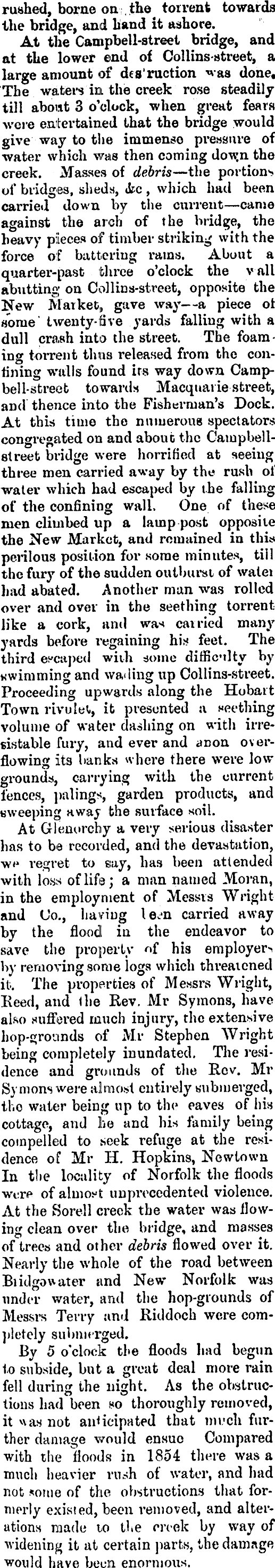rushed, borne on the torrent towards the bridge, and hand it ashore. At the Campbell-street bridge, and at the lower end of Collins-street, a large amount of des'ruction done. The waters in the creek rose steadily till about 3 o'clock, when great fears were entertained that the bridge would give way to the immense pressure of water which was then coming dow.n the creek. Masses of debris —the portions of bridges, sheds, ttc , which had been carried down by the current —came against the arch of the bridge, the heavy pieces of timber striking with the force of battering rams. About a quarter-past three o'clock the vail abutting on Collins-street, opposite the New Market,, gave way—a piece ot some twenty-five yards falling with a dull crash into the street. The foaming torrent thus released from the confining walls found its way down Camp-bell-street towards Macquarie street, and thence into the Fisherman's Dock. At this time the numerous spectators congregated on and about the Campbellstreet bridge were horrified at seeing three men carried away by the rush of water which had escaped by the falling of the confining wall. One of these men climbed up a lamp post opposite the New Market, and remained in this perilous position for some minutes, till the fury of the sudden outburst of walei had abated. Another man was rolled over and over in the seething torrent like a cork, and was carried many yards before regaining his feet. The third escaped with some difficilty by swimming and wading up Collins-street. Proceeding upwards along the Hobart Town rivulet, it presented a seething volume of water clashing on with irresistable fury, and ever and anon overflowing its banks where there were low grounds, carrying with the current fences, palings, garden products, and sweeping away the surface soil. At Glenorchy a very serious disaster has to be recorded, and the devastation, we regret to say, has been attended with loss of life; a man named Moran, in the employment of Messrs Wright and Co., having le. i n carried away by the flood in the endeavor to save the property of his employerby removing some logs which threatened it. The properties of Messrs Wright, Reed, and the Rev. Mr Symons, have also suffered much injury, the extensive hop-grounds of Mr Stephen Wright being completely inundated. The residence and grounds of the Rev. Mr Symons were almost entirely submerged, the water being up to the eaves of his cottage, and he and his family being compelled to seek refuge at the residence of Mr H. Hopkins, Newtown In tlie locality of Norfolk the floods were of almost unprecedented violence. At the Sorell creek the water was flowing clean over the bridge, and masses of trees and other debris flowed over it. Nearly the whole of the road between Biidgowater and New Norfolk was under water, and the hop-grounds of Messrs Terry and Riddoch were completely submerged. By 5 o'clock the floods had begun to subside, but a great deal more rain fell during the night. As the obstructions had been so thoroughly removed, it was not anticipated that much further damage would ensue Compared with the floods in 1854 there was a much heavier rush of water, and had not some of the obstructions that formerly existed, been removed, and alterations made to the creek by way of widening it at certain parts, the damage would have been enormous.