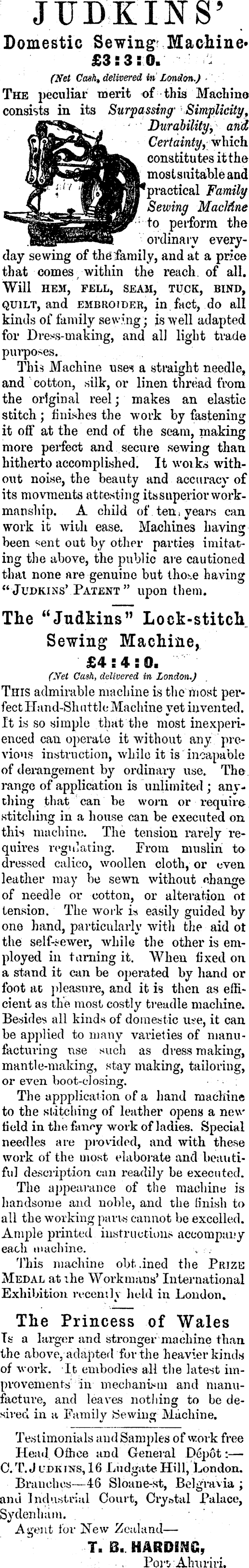 JUDKINS Domestic Sewing Machine* £3:3:0. (Net CflwA, delivered m London.,} The peculiar merit of this Machine consists in its Surpassing' Simplicity, Durability, and Certainty, which constitutes it the ■ mostsuitableand 'practical Family Sewing MacMne to perform the ordinary everyday sewing of thefamily, and at a price that comes, within the reach of all. Will HEM, FELL, SEAM, TUCK, BIND, quilt, and embroider, in fact, do all kinds of family sewing; is well adapted for Dress-making, and all light trade purposes. This Machine uses a straight needle, and cotton, silk, or linen thread from the original reel; makes an elastic stitch; finishes the work by fastening it off at the end of the seam, making more perfect and secure sewing than hitherto accomplished. It woiks without noise, the beauty and accuracy of its movments attesting its superior workmanship. A child of ten, years can work it wiih ease. Machines having been sent out by other parties imitating the above, the public are cautioned that none are genuine but tho>.e having "■Judkins* Patent " upon them. The "Judkins" Lock-stitch Sewing Machine, £4:4:0. (Net Cash, delivered in London.) This admirable machine is the most perfect Hand-Shuttle Machine yet invented. It is so simple that the most inexperienced can operate it without any previous instruction, while it is incapable of derangement by ordinary use. The range of application is unlimited ; anything that can be worn or require stitching in a house can be executed on this machine. The tension rarely requires regulating. From muslin to dressed calico, woollen cloth, or even leather may be sewn without change of needle or cotton, or alteration ot tension. The work is easily guided by one hand, particularly with the aid ot the while the other is employed in taming it. When fixed on a stand it can be operated by hand or foot at pleasure, and it is then as efficient as the most costly treadle machine. Besides all kinds of domestic use, it can be applied to many varieties of manufacturing use such as dress making, mantle-making, stay making, tailoring, or even boot-closing. The appplicat ion of a hand machine to the stitching of leather opens a new field in the faivy work of ladies. Special needles are provided, and with these work of the most elaborate and beautiful description can readily be executed. The appearance of the machine is handsome and noble, and the finish to all the working pans cannot be excelled. Ample printed instructions accompany each machine. «, . This machine obt .ined the Prize Medal at ihe Workmans' International Exhibition recently held in London. The Princess of Wales Is a larger and stronger machine than the above, adapted for the heavier kinds of work. It embodies all the latest improvements in mechanism and manufacture, and leaves nothing to be desired in a Family Sewing Machine. Testimonials and Samples of work free Head Office and General Depot:— C.T.J udkins, 16 Ludgate Hill, London. Branches—46 Sloane-st, Belgravia ; and Industrial Court, Crystal Palace, Sydenham. Agent for jSTew Zealand— PorvAhuriri.