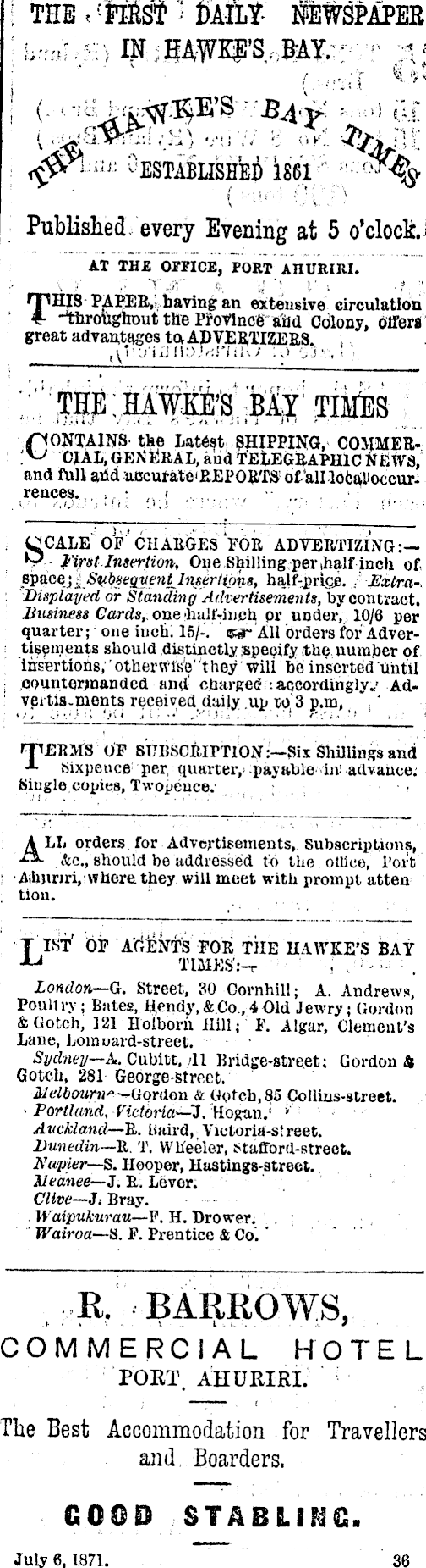 THE , : PIM ' DAILt NEWSPAPER !;•::,; ;; IN ',-mffWB .BAY. V OESTABLISHEi)0 E STABLISHEi) 1861 Published every Evening at 5 o'clock. AT THJB OFFICE, FORT AHURIIU. THIS PAPER, having an extensive circulation -tnrottghout ttte Province and Ccilony, offers great advantages to, ADVERTIZERS. CONTAINS the Latest SHIPPING, COMMERCIAL, GENERAL, and TELEGRAPHIC NEWS, and full arid uecurate<REPOßTS ; otalllbcaUoccur. *f-. : First Insertion, One Shilling,per thalf inch of half-price. ExtraDisplayed or Standing Advertisements, by contract. Business Cards, one ihaltanph, or under, 10/6 per quarter; one inch. Ift/-. ear All Orders for Advertisements should distinctly specify the number of insertions, otherwise'they will be inserted until countermanded and charged t accordingly./ Adveitis.nients received daily up u>'3 pan, ERMS OF SUBSCRIPTION:—Six Shillings and Sixpence per quarter, payable in: advance. Single copies, Twopence. ALL orders for Advertisements, Subscriptions, Ac, should be addressed to the oilice, Port •Ahnriri, where they will meet with prompt atten tion. List' of agents for the ha wee's bay TIMES':-r London— G. Street, 30 Cornhill; A. Andrews, Poultry; Bates, H,endy, & Co., 4 Old Jewry j Gordon & Gotch, 121 Holborn Hill; F. Algar, Clement's Lane, Loin uard-street. Sydney— A. Cubitt, dl Bridge-street; Gordon 4 Gotch, 281 George-street. Melbourne & Gotch, 85 Collins-street. • Portland, Victoria—~J. Hogan. ! »*' Auckland— R. Liaird, Victoria-street. Dunedin—R. T. Wheeler, Stafford-street. Napier— S. Hooper, Hastings-street. Meanee—J. R. Lever. Clive—J, Bray. Waipukurau —F. H. Drower. . Wairoa—H. F. Prentice & Co. ' R. BARROWS, COMMERCIAL HOTEL PORT AHURIRI. The Best Accommodation for Travellers and Boarders. July 6, 1871.