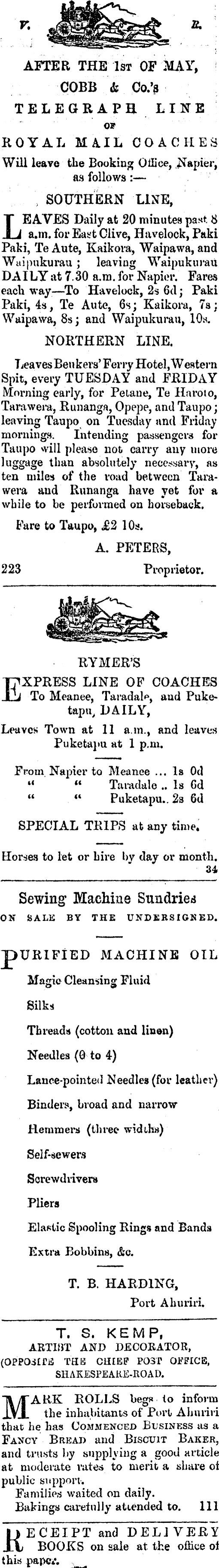 AFTER THE Ist OF MAY, COBB & Co.'s TELEGRAPH LINE OF ROYAL M4IL COACHES Will leave the Booking Office, Napier, as follows: SOUTHERN LINE, * EAVES Daily at 20 minutes past 8 _i a.m. for East Clive, Havelock, Paki Paki, Te Ante, Kaikora, Waipawa, and Waipukurau; leaving Waipukurau DAILY at 7.30 a.m. for Napier. Fares eacli way—To Havelock, 2s 6d; Paki Paki, 4s, Te Aute, 6s; Kaikora, 7s; Waipawa, 8s; and Waipukurau, 10s. NORTHERN LINE. Leaves Ben kers' Ferry Hotel, Western Spit, every TUESDAY and FRIDAY Morning early, for Pelane, Te Hnroto, Tarawera, Runanga, Opepe, and Taupo; leaving Taupo on Tuesday and Friday mornings. Intending passengers for Taupo will please not cany any more luggage than absolutely necessary, as ten miles of the road between Tarawera and Runanga have yet for a while to be performed on horseback. Fare to Taupo, £2 10a. A. PETERS, 223 Proprietor. RYMER'S pXPRESS LINE OF COACHES *J To Meanee, and Puketapu, DAILY, Leaves Town at 11 a.m., and leaves Puketapti at 1 p.m. From Napier to Meanee ... Is Od " " Taradale.. Is 6d " " Puketapu.. 2s 6d SPECIAL TRIPS at any time. Horses to let or hire by day or month. 34. Sewing Machine Sundries OK SALE BY THE UNDERSIGNED. XJRIFIED MACHINE OIL Magic Cleansing Fluid Threads (cotton and linen) Needles (Q to 4) Lance-pointed Needles (for leathei*) Binders, broad and narrow Heramers (three widths) Self-sewers Screwdrivers Pliers Elastic Spooling Rings and Bands Extra Bobbins, &c. T. B. HARDING, Port Ahuriri. T. S. KEMP, ARTI»T AND DECORATOR, (OPPOSE THE CHIEF POST OFFICE, SHAKESPEAKE-ROAD. ARK ROLLS begs to inform the inhabitants of Port Ahuriri that he has Commenced Business us a Fancy Bread and Biscuit Baker* and trusts by supplying a good article at moderate rates to merit a share of public support. Families waited on daily. Bakings carefully attended to. 11l * ECEIPT and DELIVERY j BOOKS on sale at the ofkee ot this pape**.
