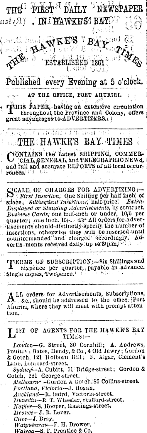 TH# [ Mft a fe6iT ' ; M#si?APER Published every Evening at 5 {/clock. - r AT THE OFFICE, POET AHURIRI. * rfSHIS PAPER; haVing an extensive circulation A throughout the Province and Colony, offers great ad£ahtageHo'ADVEßTlZ-ERS.> j THE HAWKE'S BAY TIMES (ONtAINS ? the Latest SHIPPING, COMMERCIAL, GENKRAL, and TELEGRAPHIC NEWS, i 'full and accurate REPORTS of all local occurand full an Tehee's." ; • <<CALE OP CHARGES POR ADVERTIZING :- ' Iftrst Insertion, One Shilling per half inch; of 'space; Sitbseqtienrinsef'lions,' half-price:' ExtraDisplayed or Standing Advertisements, by contract. Business Cards, one hall-inch or under, 10/6 per quarter; one inch. 15/-. ■ <£ir All orders for Advertisements' should distinctly 'Specify.- the number of insertions, otherwise they .will be .inserted until countermanded ':md charged accordingly, Ad-vei'tis-ments received daily up i.d3fp,m,'- < TERMS OF SUBSCRIPTION:—Six Shillings and sixpence per quarter, payable in advance. Single copies^Twopeuce.' * LL orders for Advertisements/Subscriptions, - &c, should be addressed to the otfice,| ;Port Ahuriri, where they will meet with prompt atteu tion. "- IST OP AGENTS POR THE HAWKE'S BAY TIMES:— London—Q. Street, 30 Cornhill; A. Andrews, Poultrv ; Bates, Ilendy,&Co.,4 Old Jewry; Gordon &Gotc'h, 121 Holboru Hill; P. Aigar, Clement's Lane, Lomoard-street. Sydneip-A.. Cubitt, II Bridge-street; Gordon* Gotch, 231 George-street. Melbourne -Gordon & Gotch,'Bs Collins-street. Portland, Victoria— J. Uojtau, Auckland— R. Unird, Victoria-street. Dunedin—R. T. \V heeler, Muflord-street. Napier—&> Hooper, Hastih'gS-sti'eet, Meanee—S. R. Lever. CUve—3. Bray. Waipxikuruu— P. 11. Drower. Wairoa— S. P. Prentice & Co.