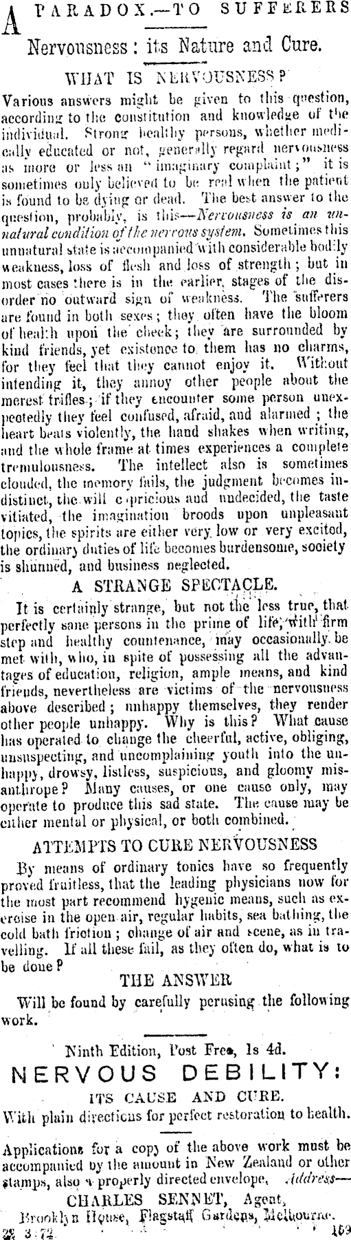 A PARADOX.—TO SUFFERERS Nervousness: its Nature and Cure. WHAT IS"NERVOUSNESS ? Various answers might be given to this ■ question, according to the constitution and knowledge of the individual. Strong healthy persons, whether medically educated or not, generally regard ner.ions.nc63 as iriore or less an "imaginary complaint;" it is sometimes only believed to be real when the patient is found to be dying or dead. The best answer to the question, probably, is this— Nervousness is an unnatural condition of the verrom system. Sometimes this unuatural state is accompanied 'with considerable bodily weakness, loss of flesh and loss of strength ; but in most cases there is in the earlier, stages of the disorder no outward sign of weakness. The sufferers are found in botli sexes; they often have the bloom of health upon the'cheek; they are surrounded by kind friends, yet existence to them has no charms, for they feel that they cannot enjoy it. Without intending it, they annoy other people about the merest trifles; if they encounter some person unexpectedly they feel confused, afraid, and alarmed ; the heart beats violently, the hand shakes when writing, and the whole frame at times experiences a complete treniulousness. The intellect also is sometimes clouded, the memory fails, the judgment, becomes indistinct, the-will c ipricious and nudecided, the taste vitiated, the imagination broods upon unpleasant topics, the spirits are either very, low or very excited, the ordinary duties of life becomes burdensome, sooiety is shunned, and business neglected. A STRANGE SPECTACLE. It is certainly strange, but not the less true, that perfectly sane persons in the prime of life;'vvith 1 firm step and healthy countenance, may occasionally.be met with, who, in spite of possessing all the advantages of education, religion, ample means, and kind friends, nevertheless are victims of the nervousness above described ; unhappy themselves, they render other people unhappy. Why is this? What cause has operated to change the cheerful, active, obliging, unsuspecting, and uncomplaining youth into the unhappy, drowsy, listless, suspicious, and gloomy misanthrope? Many causes, or one cause only, may operate to produce this sad state. The cause may be either mental or physical, or both combined. ATTEMPTS TO CURE NERVOUSNESS Ry means of ordinary tonics have so frequently proved fruitless, that the leading physicians now for the most part recommend hygenic means, such as exercise in the open air, regular habits, sea bathing, the cold batli friction ; change of air and *cene, as in travelling. If all these fail, as they often do, what is to be done P THE ANSWER Will be found by carefully perusing the following work. Ninth Edition, I'ost Fre*, Is 4d. NERVOUS DEBILITY: ITS CAUSE AND CURE. With plain directions for perfect restoration to health. Applications for a copj of the above work must be accompanied oy the amount in New Zealand or other' Stamps, also n properly directed envelope, Address — CHARLES SENNET, Agent, Rrooltljn House, Flagstaff. Gardens, JkiUoume.