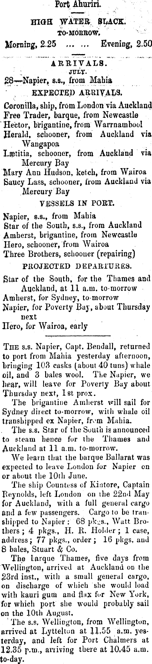 PortAhuriri. HIGH TO-MOBBOW. Morning, 2.25 , Evening, 2.50 ARRIVALS. 28-—Napier, s.s., from Mania EXPECTED ARRIVALS. Coronilla, ship, from London via Auckland Free Trader, barque, from Newcastle Hector, brigantine, from Warrnambool Herald, schooner, from Auckland via Wangapoa L©titia, schooner, from Auckland via Mercury Bay Mary Ann Hudson, ketch, from Wairoa Saucy Lass, schooner, from Auckland via Mercury Bay VESSELS IN PORT. Napier, s.s., from Mahia Star of the South, s.s,, from Auckland Amherst, brigantine, from Newcastle Hero, schooner, from Wairoa Three Brothers, schooner (repairing) PROJECTED DEPARTURES. Star of the South, for the Thames and Auckland, at 11 a.m. tomorrow Amherst, for Sydney, to-morrow Napier, for poverty Bay, about Thursday next Hero, for Wairoa, early The s.s. Napier, Capt. Bendall, returned to port from Mahia yesterday afternoon, bringing 103 casks (about 40 tuns) whale oil, and 3 bales wool. The Napier, we hear, will leave for Poverty Bay about Thursday next, Ist prox. The brigantine Amherst will sail for Sydney direct to-raorrow, with whale oil transhipped ex Napier, frvm Mahia. The s.s. Star of the South is announced to steam hence for the Thames and Auckland at 11 a.m. to-morrow. We learn that the barque Ballarat was expected to leave London for Napier on or about the 10th June. The ship Countess of Kintore, Captain Reynolds, left London on the 22nd May for Auckland, with a full general cargo and a few passengers. Cargo to be transhipped to Napier : 68 pk-s., Watt Brothers ; 4 pkgs., H. R. Holder; 1 case, address j 77 pkgs., order ; 16 pkgs, and 8 bales, Stuart & Co. The larque Thames, five days from Wellington, arrived at Auckland on the 23rd inst., with a small general cargo, on discharge of which she would load with kauri gum and flax for New York, for which port she would probably sail on the 10th August, The s.s, Wellington, from Wellington, arrived at Lyttelton at 11,55 a.m. yesterday, and left for Port Chalmers at 12.35 p.m., arriving there at 10.45 a.m. to-day.