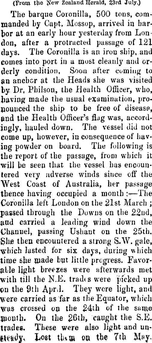 (Frani t£e New Zealand Herald, 23rd July,) The barque Coronilla, 500 tons, commanded by Capt, Mossop, arrived in bartor at an early hour yesterday from London, after a protracted passage of 121 days. The Coronilla is an iron ship, and comes into port in a most cleanly and orderly condition, Soon after coming to an anchor at the Heads she wa9 visited by Dr, Philson, the Health Officer, who, having made the usual examination, pronounced the ship to be free of disease, and the Health Officer's flag was, accordingly, hauled down. The vessel did not come up, however, in consequence of having powder on board. The following is the report of the passage, from which it will be seen that the vessel has encountered very adverse winds since off the West Coast of Australia, her passage thence having occupied a month :•<—The Coronilla left London on the 21st March ; passed through the Downs on the 22nd, and carried a leading wind down the Channel, passing Ushant on the 25th. She then encountered a strong S.W. gale, which lasted for six days, during which time she made but little progress. Favorable light breezes were afterwards met with till the N.E. tradt s were picked up ©n the 9th April. They were light, and were carried as far as the Equator, which was crossed on the 24th of the same month. On the £6tb, caught the S.li. Uades. These were also light and unetewly* Lost tlan eu the 7th M»y.