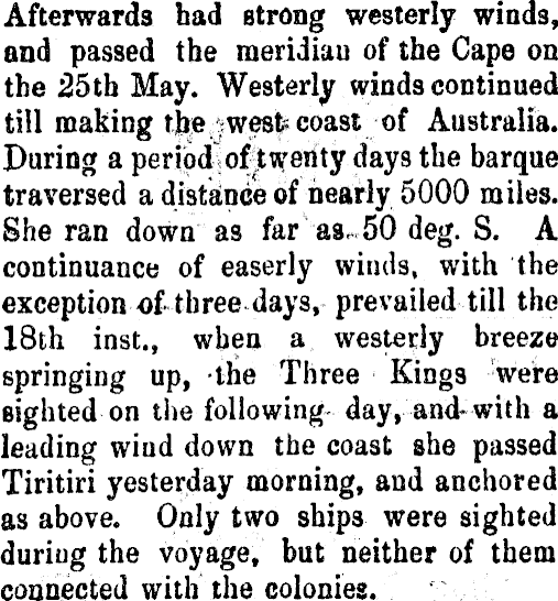 Afterwards had strong westerly winds, and passed the meridian of the Cape on the 25th May. Westerly winds continued till making coast of Australia. During a period of twenty days the barque traversed a distance of nearly 5000 miles. She ran down as far as, 50 deg. S. A continuance of easerly winds, with the exception of- three days, prevailed till the 18th inst., when a westerly breeze springing up, the Three King 9 were sighted on the following day, and* with a leading wind down the coast she passed Tiritiri yesterday morning, and anchored as above. Only two ship 3 were sighted during the voyage, but neither of them connected with the colonies.