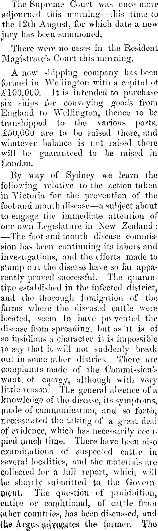 The Supreme Court was once, more adjourned this morning—this time to the 12th August, for which date a new jury lias been summoned. There were no eases in the Resident Magistrate's Court this mnining. A new shipping company has been formed in Wellington with a capital of £ 100,000. It is intended to purchase .six ships for conveying goods from England to Wellington, thence to be transhipped to the various ports. £50,000 are to be raised there, and whatever balance is not raised there will be guaranteed to be raised in London. By way of Sydney vve learn the following relative to the action taken in "Victoria for the prevention of the foot-and-mouth disease—a subject about to engage the immediate attention of our own Legislature in New Zealand : —The foot and-mouth disease commission has been continuing its labors and investigations, and the efforts made to stamp o-jI the disease have so fai apparently proved successful. The quarantine established in the infected district, and the thorough fumigation of the farms where the diseased cattle were located, seem lo have prevented the disease fVom spreading, but as it is of so insidious a character it is impossible to say that it "ill not suddenly break out in .some other district. There are pomplamts made of the Commission's Want, of energy, although with very little reason. The general, absence of a knowledge of the disease, its symptoms, (node of communication, and so forth, necessitated the taking of a great deal of evidence, which has necessarily occupied mucji time. There have been also examinations of suspected cattle in several localities, and the mateiials are Collected tor a full report, which will be shortly submitted to the Govern W.eul. The question of prohibition, entiie or conditional, of cattle from ftihev countries, has been discussed, and il*<? Argus a.vlvQGates the former. The-,