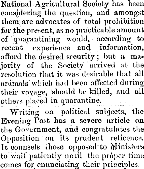 National Agricultural Society has been considering the question, and amongst thera; are advocates of total prohibition for the present, as no practicable amount of ''quarantining would, according to recent experience and information, afford the desired security; but a majority of the Society arrived at the resolution that it was desirable that all animals" which had been affected during their voyage, should be killed, and all others placed in quarantine. Writing on political subjects, the Evening Post has a severe article on the Government, and congratulates the Opposition on its prudent reticence. It counsels chose opposed "to Ministers to wait patiently until the proper time comes for enunciating their principles.