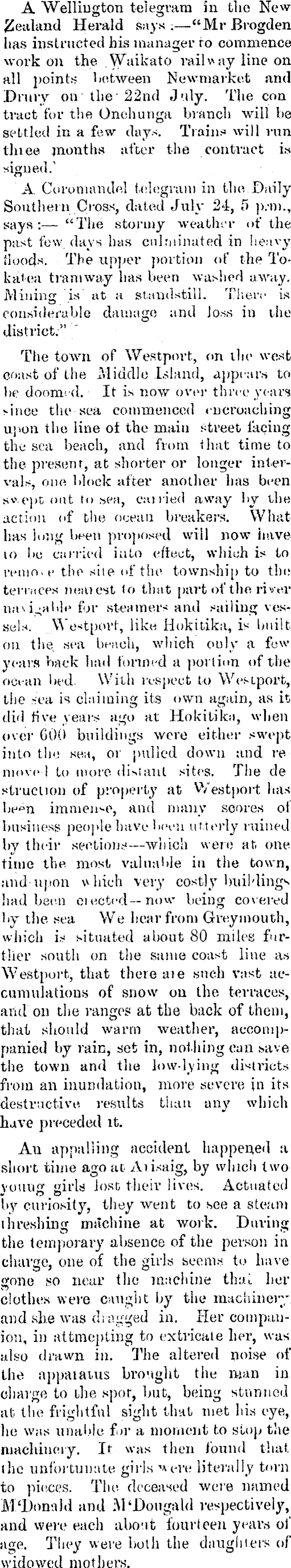 A Wellington telegram in the New Zealand Herald says . "Mr Brogden has instructed his manager ro commence work on the Waikato rail v* ay line on all points between Newmarket and Drury on the 22nd July. The con tract for the Onehunga branch will, be settled in a few days. Train* will run thiee months after the contract is signed.' A. Coromandel telegram in the Daily Southern Cross, dated July 2<i, a p.-m., says : "The stormy weather of the past few days has culminated in heavy floods. The upper portion of the To-kai-ea tramway has been washed away. Mining is at a standstill. There is considerable damage and loss in the district." The town of Westport, on the west coast of the Middle Island, appears to be doomed. It is now over three years since the sea commenced encroaching upon the line of the main street facing the sea beach, and from that time to the present, at shorter or longer intervals, one block after another has been swept out to sea, ennied away by the action of the ocean breakers. What has long been proposed will now iiave 10 be carried into effect, which is to reniO'e the site of the township to the terraces nearest to that part of the river naugahb* for steamers and sailing vessels. Westport, like Hokitika, is built on the sea beach, which only a few years back had formed a portion of the ocean bed. With respect to Westport, the sea is claiming its own again, as it did five years ago at Hokitika, when over 600 buildings were either swept into the sea, or pulled down and re move Ito more distant sites. The de struciion of property at Westport. has be<m immense, and many scores ot business people have been utterly ruined by their sections —which were at. one time the most valuable in the town, and upon vvhich very costly buildings had been elected—now being covered by- the sea We hear from Greymouth, which is situated about 80 miles further south on the same coast line as Westport, that there ate such vast accumulations of snow on the terraces, and on the ranges at the back of them, that should warm weather, accomppanied by rain, set in, nothing can save the town and the low-lying districts from an inundation, more severe in its destructive, results than any which have preceded it. Au appalling accident happened a short time ago at Aiisaig, by which two vouuff siirls lose their lives. Actuated by curiosity, they went to see a steam threshing machine at work. During the temporary absence of the person in charge, one of the girls seems, to have <rone so near the machine thai her ciothes were caught by the machinery and she was dragged in. Her companion, in attmepting to extricate her, was also drawn in. The altered noise of the appaiaius brought the man in charge to the spot, but, being stunned at the frightful sight that met his eye, he was unable for a moment to stop the machinery. It was then found that the unfortunate girls were literally torn to pieces. The deceased were named M'Donald and M'Dougald respectively, and were each about fourteen years of age. They were both the daughters of widowed mothers,