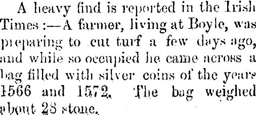 A heavy find is reported in the Irish Times :—A fanner, Jiving at Boyle, was psepaving to cut turf a few days ago, and while so occupied lie came ucroHS a bag filled with .silver coins of the yeaiv 1566 and 15,72., The hug weighed plwut %$ . s to.ne.,