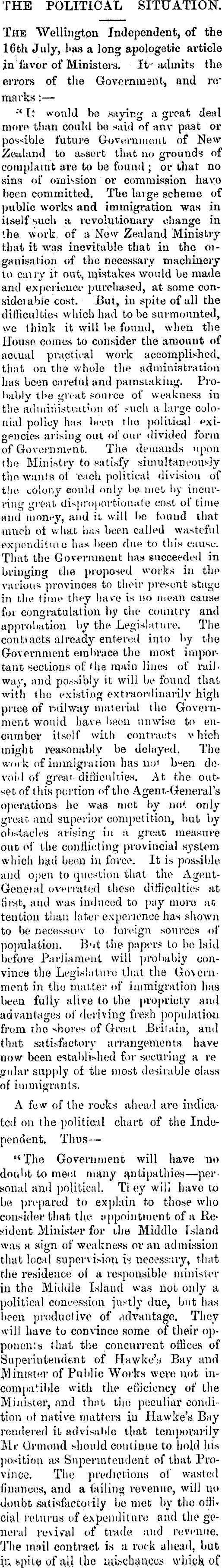 THE POLITICAL SITUATION. The Wellington Independent, of the 16th July, has a long apologetic article in favor of Ministers. It admits the errors of the Government, and re" marks: — :i It would be saying a great deal morn than could be said of anv past or possible future Government of New Zealand to assert that no grounds of complaint are to be found ; or that no sins of omission or commission have been committed. The large scheme of public works and immigration was in itself such a revolutionary change in '.he work, of a New Zealand Ministry that it was inevitable that in the 01ganisation of the necessary machinery to carry it out, mistakes would be made and experience purchased, at some considerable cost. But, in spite of all the difficulties which had to be surmounted, we think it will be found, when the House comes to consider the amount of actual practical work accomplished, that on the whole the administration has been careful and painstaking. Probably the great source of weakness in the administration of such a large colonial policy has been the political exigencies arising out of our divided form of Government. The demands upon the Ministry to satisfy simultaneously the wants of "each political division of the colony could only be met by incurring great disproportionate cost of time and money, and it will be found that much ot what has been called wasteful expendituio has been due to this cause. That the Government has succeeded in bringing the proposed works in the various provinces to their present stage in the time they have is no mean cause for congratulation by the country and approbation by the Legislature. The con ti acts already entered into by the Government embrace the most important sections of the main lines of railway, and possibly it will be found that with the existing extraordinarily high price of railway material the Government would have been unwise to encumber itself with contracts v hich might reasonably be delayed. The work of immigration has not b a en devoid of great difficulties. At the outset of this portion of the A gent-General's operations he was met by not only great and superior competition, but by obstacles arising in a great measure out o\' the conflicting provincial system which had been in force. It is possible and open to question that the AgentGeneial overrated these difficulties at first, and was induced to pay more at ten Lion than later experience has shown to be necessarv to foreign sources of population. But the papers to be laid before Parliament will probably convince the Legislature that the Government in the matter of immigration has been fully alive to the propriety and advantages of deriving fresh population from the shores of Great Britain, and that satisfactory arrangements have now been established for securing a re gular supply of the most desirable class of immigrants. A few of the rocks ahead are indicated on the political chart of the Independent. Thus—- " The Government will have no doubt to meet many antipathies—per sonal and political. Ti ey will have to be prepared to explain to those who consider that the appointment of a Resident Minister for the Middle island was a sign of weakness or an admission that local supervision, is necessary, that the residence of a responsible minister in the Middle Island was not only a political concession justly due, but has been productive of advantage. They will have to convince some of their opponents that the concurrent offices of Superintendent of Hawke'.i Bay and .Minister of Public Works were not incompa'ible with the efficiency of the Minister, and that the peculiar condition of native matters in Hawke's Bay rendered it advisable that temporarily Mr Ormond should continue to hold his position as Superintendent of that Province. The predictions of wasted finances, and a failing revenue, wilJ no doubt satisfactorily be met by the official returns of expenditure and the general revival of trade and revenue. The mail contract is a rock ahead, but u; spite of all I.be mischances which of