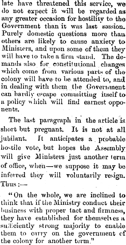 late have threatened this service, we do not expect it will be regarded as any greater occasion for hostility to the Government than'it was last sassion. Purely domestic questions more than others are likely to cause anxiety to Ministers, and upon some of them they will have to take a firm stand. The demands also for constitutional changes which come from various parts of the colony will have to he attended to, and in dealing with them the Government can hardly escape committing itself to a policy vn Inch will find earnest opponents. The last paragraph in the article is short but pregnant. It is not at all jubilant. ft anticipates a probable hostile vote, but hopes the Assembly will give Ministers just another term of office, when—we suppose it may be inferred they will voluntarily resign. Thus;— "On the whole, we are inclined to think that if the Ministry conduct their business with proper (act and firmness, they have established for tbetnsehes a sufficiently strong majority to enable them to carry on the government of the colony for another term."