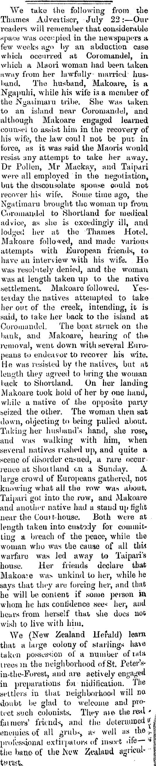 We take the following from the Thames Advertiser, July 22:—Our readers will remember that considerable .<paoe was occupied in the newspapers a, few weeks ago by an abduction case which occurred at Coromande], in which a Maori woman had been taken awuy from her lawfully married husband. The husband, Makoare, is a JSTgapuhi, while his wife is a member of the Ngaiiniaru tribe. She was Uiken to an island near Coromande:!, and although Makoare engaged learned counsel to assist him in the recovery of his wife, the law coul 1 nob be put in force, as it was said the Maoris would resist any attempt to take her away. Dr Pollen, Mr Mackay, and Taipari were all employed in the negotiation, bub the disconsolate spouse oould not recover his wife. Some time ago, the Ngatimaru brought the woman up from Coromandel to Shortland for medical advice, as she is excedingly ill, and lodged her at the Thames Hotel. Makoare followed, and made various attempts with European friends, to have an interview -with his wife. He was resolutely denied, and the woman was at length taken up to the native settlement. Makoare followed. Yesterday the natives attempted to take her out of the creek, intending, it is said, to lake her back to the island at Ooromaiidel. The boat struck on the bank, and Makoare, hearing of the removal, went down with several Europeans to endeavor to recover his wile. He was resisted by the natives, but at length they agreed to bring the woman hack to Shortland. On her landing Makoare took hold of her by one hand, while a native of the opposite party seized the other. The woman then sat down, objecting to being pulled about. Taking her husband's hand, she rose, and was walking with him, when several natives rushed up, and quite a scene of disorder ensued, a rare occur reuee at Shoitland en a Sunday. A large crowd of Europeans gathered, noc knowing what all the row was about. Taipari got into the row, and Makoare and another native had a stand up light near the Com r house. Both were at length taken into custody for commit' ting a breach of the peace, while the woman who was the cause of all tbw warfare was led away to Taipari's house. Her friends declare that Makoare was unkind to her, while he says that they are forcing her, and that he will be content if some person in whom he has confidence see* her, and hears from herself that she does not wish to live with him. We (New Zealand Herald) leam that a large colony of starlings have taken possession of a number of rata trees m the neighborhood of St. Peter's-in-the-Forest, and are actively engaged in preparations foi nidification. The settlers in that neighborhood will nodoubt be glad to welcome and protect such colonists. They aie the real > i frimers' friends, and the determined tf I enemies, of all grubs, as well as the,,! professional extirpators of insect «i|e l »| the bane of the iNew Zealand ttgricttl- ; fo'VWth