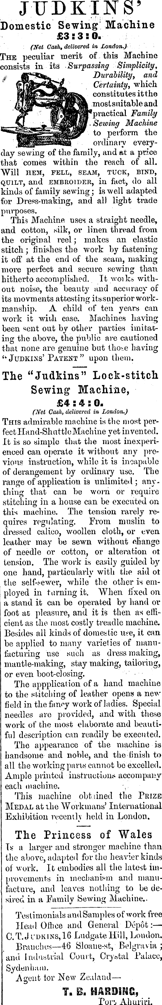 JTJDKINS* Domestic Sewing Machine £3 ■ 3 ■ Ob (Net Cash, delivered in London.) The peculiar merit of this Machine consists in its Surpassing Simplicity, Durability, and Certainty, which . constitutes it the mostsuitable and •practical Family \ . Sewing Machine to perform the ordinary everyday sewing of the family, and at a price that comes within the reach of all. Will HEM, PELL, SEAM, TUCK, BIND, quilt, and embroider, in fact, do all kinds of family sewing; is well adapted for Dress-making, and all light trade purposes. This Machine uses a straight needle, and cotton, silk, or linen thread from the original reel ; makes an elastic stitch; finishes the work by fastening it off at the end of the seam, making more perfect and secure sewing than hitherto accomplished. It woiks without noise, the beauty and accuracy of its movments attesting its superior workmanship. A child of ten years can work it wiih ease. Machines having been sent out by other parties imitating the above, the public are cautioned that none are genuine but those having '"Judkins' Patent" upon them. The "Judkins" Lock-stitch Sewing Machine, £4 S 4 S 0. (Net Cash, delivered in London.) This admirable machine is the most perfect Hand-Shuttle Machine yet invented. It is so simple that the most inexperienced can operate it without any previous instruction, while it is incapable ;of derangement by ordinary use. The | range of application is unlimited ; anything that can be worn or require stitching in a house can be executed on this machine. The tension rarely requires regulating. From muslin to dressed calico, woollen cloth, or even leather may be sewn without change of needle or cotton, or alteration ot tension. The work is easily guided by one hand, particularly with the aid ot the self-.-ewer, while the other is employed in tiirning it. When fixed on a stand it can be operated by hand or foot at pleasure, and it is then as efficient as the most costly treadle machine. Besides all kinds of domestic use, it can be applied to many varieties of manufacturing use such as dress making, mantle-making, stay making, tailoriug, or even boot-closing. The appplication of a hand machine to the stitching of leather opens a new field in the fan^y work of ladies. Special needles are provided, and with these work of the most elaborate and beautiful description can readily be executed. The appearance of the machine is handsome and noble, and the finish to all the working pans cannot be excelled. Ample printed instruction** accompany each machine. This machine obtained the Prize Medal at the Workmans' International Exhibition recenth held in London. The Princess of Wales Is a larger and stronger machine than the above, adapted for the heavier kinds of work. It embodies all the latest improvements in mechanism and manufacture, and leaves nothing to be desired in a Family Sewing Machine.. Testimonials and Samples of work free Head Office and General Depot:— C.T.J i'DKiNS,I6 Ludgate Hill, London. Branches —46 Sloane-st, Belgravia ; and Industrial Court, Crystal Palace, Sydenham. Agent lor New Zealand—■ Ton Ahuriri.