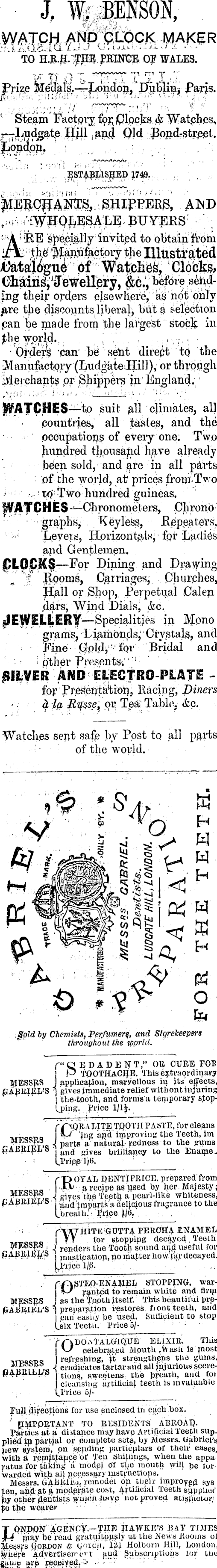 J, W, BENSON, .WATCH ,ANP QLOCK MAKER TO H.R.Ja."'|P PRWGE OF WALES. ■v' ?';' gl T, > ~ T* r y T . Prize jKlecl^ls.—rLondon, * Dunlins |*aris. Steam Factpry forelocks & Watph.es, r~Ludgate Jljll ,sq 4 Qlcl JJondTStr.eel. |jondpn. ESTABLISHED 1749. |IERC|[AMS, SHIPPERS, AND fi r BUYERS ' ■' A ; ORE invited to obtain from b the''3^anufactory the Illustrated i)aitaj%uo of Clocks, ing their orders elsewhere, as not only jare the discounts liberal, but a selection pan be made from the largest stock in jthe world. Orders can be sent direct to the Manufactory (Ludgkte Hill), or through Merchants or Shippers in England. suit all climates, all countries, all tastes, and the occupations of every one. Two hundred thousand have already been sold, and are in all parts of the world, at prices from Two ' ,tp Two hundred guineas. WATCHES —Chronometers, Chronb graphs, Xeyless, Kepeaters, Leyets, Horizontals, fpi* LadiCs and Gentlemen. g)Lo£BCs— For Dining and Drawing "i Jipoms, Carriages, Churches, Hall or Shop, Perpetual Calep. jlars, Wind Dials, &c. in Mono grams, LiamOnids, Crystals, and Fine Qplfy ipr Bridal and Other Presents;'/' for Racing, Diners d, la or Tea Table. &c. Watches sent safe by Post to all parts • of the world. =1 >i ¥1 *' r> tf Spld by Chemists, Perfumery, and Storekeepers f throughout the tpprld. f'QEDADENT," OK, CUBE FOB j P TOOTHaCIJE. This extraordinary SIESSRS j application, mary'ellous in jts ejects, fiABRIEL'S n gives immediate relief without injuring | the4»o6th, and forms a temporary sfopLj)ing. Price 1/I^. J Jng and improving the Teeth, lm ' .,m.rrvr,« -\ i.' ar te a natural redness to the gums UAKiLlpija an(J gives brilliancy to the Ename.. tl'riceT/fj. >OYAL DENTIFRICE, prepared from trl1 „ el ,„ . ,>V a recipe as u.sed hy her Majesty; _ M s X a 1 gives the Teetlf a pearl-like whiteness, f,AiJiUJW& and'imparts a delicious fragrance to the [breath.' 'Price \j<i.' fTXTHITK GOTTA PEROHA ENAMEL I fy tor Stoppipg decayed Teeth _ v l j£?Si " ' J. renders the Tooth sound and useful lor ] jnastication.no master how far decayed. [.Price 1/13. STOPPING, war- | %-J rented to remain white and firm MESSRS Jas the Tpp'th itself. This beautiful prepABRIEL'S "\ preparation restores fiont teeth, and I can easii'y be used. Sufficient to stop Lsix Teetu. Price 5/f ELIXIR. This | w celebrated Alputh -VVasli is most , tt , OC tjo 1 refreshing, "it strengthens the gums, _ rJ?iTr*Q i eradicates tartaraiid all jnjurious secre-fjrAliii.Liiii-a , lion g > SW eetens the breath, and to» I cleansing artificial teeth is invaluable {.Price 6/FuiU directions for use enclosed in each box. IMPORTANT TO RESIDENTS ABROAD. Parties at a distance may have Artificial Teeth supplied in partjal or complete sots, by Messrs. Gabriel's new system, on sending particulars of their cases, with a remjtpance'of Ten shillings, wheu the a ppa ratus for taking a inodej of the mouth will be torwarded with ah necessary instructions. Messrs. GABRI-EL remodel on their improved sys fen, and at ja moderate cost, Artificial Teeth supplim 1 hy other dentistsiwiiich.hHve not proved fo the wearer • ONPON AGENCy.-THE |IAWKE ? S PAY TIMES ' piay be read gratmtppsly at the News Rooms ol Messrs Gordon & GO'icu', JLiSJL Holborn Hill, London, jyhere Advertiserrct and Subscriptions lor the gVuxg avp received. > • -"'