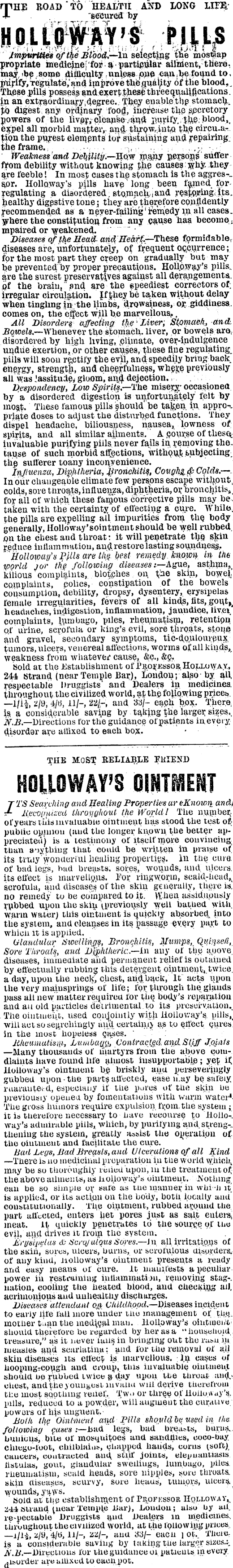 THE ROAD "TO HEALTH A2fD LONG LITE "secured by impurities of Stood,— in selecting the propriate taiedicjnepfor a ■ particijilar ailment, there, may, >be some difficulty unless pue can ; be found to. pupfy, regulate," and improve thenuality of the blood,, Tb,ese pills possess and exert ,tb.eso three quaUflcations. in an extraordinayy-degree..: They enable.the stomach,, % digest any ordinary foof|, increase the secretory powers of the Uvgr, cleansevahd purify, j&e; blood,, all morbid matter, and throWrintQ th,e cirpu-a-tion the piirest elements tor sustaining and repairing, the frame. , ,' . Weakness and Debility.— How many persons suffer from debility without knowing fiie pauses they are feeble! In most cases the stomach is the aggres--spr. Holloway's p|lls have' long been famed for regulating a disordered, stomacfei and resf.p#mgits. healthy digestive tone; they are therefore confidently Recommended as a neyer-failing 'remedy in all cases. Vhere the constitution from any pause has become, mpaired or weakened. -•--.- Diseases of the Mead. and. Heart\— These formidable, diseases are, unfortunately, of frequent occurrence; fpr the most part they creep on gradually but may be prevented by proper precautions. Holloway's pills, are the surest preservatives against all derangement:*, pf the brain,'and are the speediest correctors of, irregular circulation. If Jhey be taken without delay when tingling jit/the limbs, drowsiness, or, giddiness, comes on, the effect will be marvellous., All Disorders affecting tlifi'Liver, Stqrnaefij andBqwels. —Whenever the stomach, liver, or bowels aredisordered by high living, eliinate, over-indulgence undue exertion,"or other causes, these tine regulating piils will soon rectify the evil, and speedily bring back energy, strength, and cheerfulness, whgje previously all was .lassitude* gloom, anijl dejection. Despondency, Low Spirits,—The misery; occasioned by a disordered digestion is unfortunately felt by mo&t. These famous pills should be tafcen in appro-*. prjate doses to adjust the disturbed functions. They dispel headache, biliousness, nausea, lowness of spirits, and all similar ailments. A course of invaluable purifying pills never fails in i-emoving the. of such morbid affections, without subjectingthe sufferer toany inconvenience. Influenza, Diphtheria, Bronchitis, Cough&sColds. — In our changeable climate few persons escape without, colds, sore throats,influenza, diphtheria, or, bronchitis,, for all of which these fanibus corrective pills may betaken with the certainty of effecting a cure. While. the pills are expelling all impurities from the body generally, Holloway'sointment should be well rubbed, on the chest and throat: it will penetrate the, skin reduce inflammation, and.restore lasting soundness.. 'Holloway's Pills are the best remedy known in the ■world jor ttig following diseases ;—Ague, asthma, kilious comolaints, blotches on. t"ne skin, bowel complaints,* polics, constipation of the bowels consumption, debility, dropsy, dysentery, erysipelas female irregularities, fevers of all kinds, fits, headaches, indigestion, inflammation, jaundice, livei complaints, lumbago, piles, rheumatism, retentipn qf urine, scrofula or king's evil, sore throats, stpne and gravel," secondary symptoms, tic-do,uloureux, tumors, ulcers, venereal affections, worms of all kinds,, weakness from whatever cause, &c., &<?. Sold at the Establishment of Processor. Hollo WAX. 244 strand (near Temple Bar), London; also by all. respectable Druggists and Dealers in medicines. throughout the civilized world, a£ the. following prices. —l/i-i-, 2/9, 4/ti, 11/-, 22/-, and 33/- eaph X*p%, There. is a considerable saving by ta.kj.ng the larger sizes., N.B.— Directions for the guidance of patients ineveiy disorder are affixed to each box. THE MOST EELIABLE EKIEND /TS Searching and Healing Properties ur eKnown and, Recognized throughout the World! The number, of years this invaluable ointment has stood the test ofr public opinion (and the longer known the better appreciated) is a testimony of itself more convincing than a-iything that could be written in praise of' its truiy wonderiul healing properties. In the cure, of bad legs, bad breasts, sores, wounds, and ulcers, its effect is marvellous. Eor ringworm, scald-head,, scrofula, and diseases of the skin generally, there is] no remedy to be compared to it. M'hen assiduously rubbed upon the skin uireviously well bathed with warm water) this ointment is quickly absorbed into the system, and cleanses in its passage every part to whicn it is applied. Glandular Stoellings, Bronchitis, Mumps, . QiiinseK, Sore Throat's, and Dlphllwric—in any of the auove. diseases, immediate and permanent relief is obtained by effectually rubbing this detergent ointment,.twice, a day, upon the neck, chest, an<|back, It acts upon the very mainsprings of life; for through the glands pass all new matter requireu tor the body's reparation and an old particles detrimental to its preservation. The ointment, used conjointly with Holloway's. pills,, willuctsosearchingly anil.certainly as to effect cures in the most hopeless cases. liheumatisiu, Lumbago, Contracted, and Stiff J.Qinls —Many thousands of martyrs from the above pomdlaints have found life almost insupportable; yep if. Holloway's ointment be briskly aim perseveringly gubbeU upon - the parts affected, ease n'.ay be safeiy ruarautec-d, especially if tlie pm'es of the skin be previously opened by fomentations with warm water* The gross humors require expulsion from, the system ; it is therefore necessary to have recourse to Holloway's admirable pills, which, by purifying and.streng-. theniug the system, greatly assist the operation of the ointment and facilitate the cure. Bad Legs, Bad Breasts, and Ulcerations of all Kind —There is no medicinal preparation in the world which, may be so thoroughly relied upon, in the treatment of, the above ailments, as holloway's ointment. .Nothi