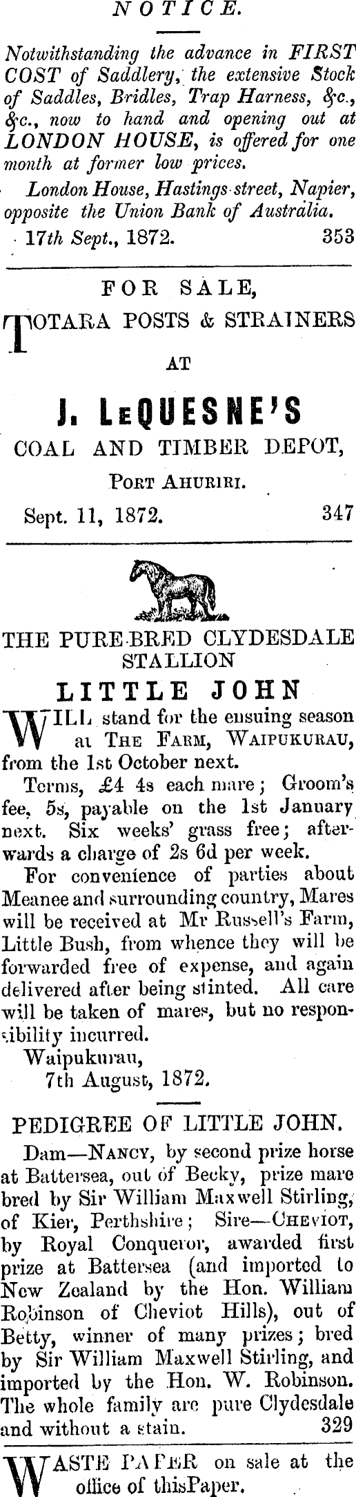 NOTICE. Notwithstanding the advance in FIRST COST of Saddlery, the extensive Stock of Saddles, Bridles, Trap Harness, tyc, now to hand and opening out at LONDON HOUSE, is offered for one month at former low prices. London House, Hastings street, Napier, opposite the Union Bank of Australia. 17th Sept., 1872. 353 FOR SALE, 10TARA POSTS & STRAINERS COAL AND TIMBER DEPOT, Pout Ahuriri. Sept. 11, 1872. 34; THE PURE BRED CLYDESDALE STALLION LITTLE JOHN I ILL stand for the ensuing season ai The Farm, Waipukurau, from the Ist October next. Terms, £4 4s each mare; Groom's fee, ss, payable on the Ist January next. Six weeks' grass free; afterwards a charge of 2s 6d per week. For convenience of parties about Meanee and surrounding country, Mares will be received at Mr Russell's Farm, Little Bush, from whence they will be forwarded free of expense, and again delivered after being slinted. All care will be taken of mares, but no responsibility incurred. Waipukurau, 7th August, 1872. PEDIGREE OF LITTLE JOHN. Dam—Nancy, by second prize horse at Battersea, out of Becky, prize mare bred by Sir William Maxwell Stirling, of Kier, Perthshire; Sire—Cheviot, by Royal Conqueror, awarded first prize at Battersea (and imported to New Zealand by the Hon. William Robinson of Cheviot Hills), out of Betty, winner of many prizes; bred by Sir William Maxwell Stirling, and imported by the Hon. W. Robinson. The whole family are pure Clydesdale and without a stain. 329 ,'ASTE PAFIIiR on sale at the oliice of this Paper,